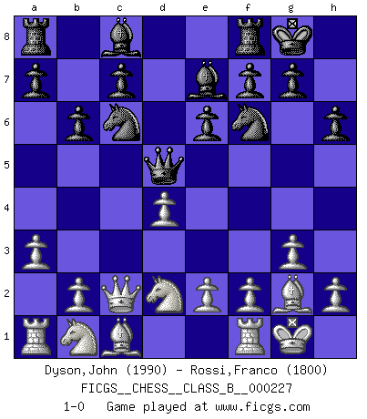 Last move : 1-0 2015 August 20 21:22:26 [Event "FICGS__CHESS__CLASS_B__000227"] [Site "FICGS"] [Date "2015.07.02"] [Round "1"] [White "Dyson,John"] [Black "Rossi,Franco"] [Result "1-0"] [WhiteElo "1990"] [BlackElo "1800"] 1.d4 Nf6 2.c4 e6 3.g3 d5 4.Nf3 Nc6 5.Bg2 Be7 6.O-O O-O 7.Qc2 h6 8.a3 b6 9.cxd5 Qxd5 10.Nfd2 1-0 This chess game has been lost on time (started : 2015.07.02 20:59:29) Catalan Opening Kingside Castling by player White (move 6) Kingside Castling by player Black (move 6) Player White won this chess game. Follow this game move after move (download)It is difficult to play against Einstein's theory --on his first loss to Fischer. (Mikhail Tal) Ich verachte Kasparow. (Viktor Kortschnoi) El Ajedrez es una guerra en un tablero. El objetivo es aplastar la mente del oponente. (Bobby Fischer) Le génie consiste à savoir transgresser les règles au moment opportun. (Teichmann) History is a gallery of pictures in which there are few originals and many copies. (Alexis de Tocqueville)