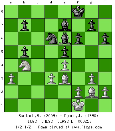 Last move : 1/2-1/2 2015 October 12 10:48:26 [Event "FICGS__CHESS__CLASS_B__000227"] [Site "FICGS"] [Date "2015.07.02"] [Round "1"] [White "Bartsch,Reinhard Andrea"] [Black "Dyson,John"] [Result "1/2-1/2"] [WhiteElo "2009"] [BlackElo "1990"] 1.c4 e5 2.Nc3 Nf6 3.g3 d5 4.cxd5 Nxd5 5.Bg2 Nb6 6.Nf3 Nc6 7.d3 Be7 8.O-O O-O 9.a3 Be6 10.b4 a5 11.b5 Nd4 12.Rb1 f6 13.Nd2 Qc8 14.e3 Nf5 15.Qc2 Rd8 16.Bb2 Nd6 17.Rbc1 a4 18.Nde4 Nf5 19.Rfe1 Qd7 20.Bf1 Bb3 21.Qe2 Rac8 22.Nd2 Bf7 23.Nc4 Nd6 24.Nxb6 cxb6 25.Nxa4 Qxb5 26.Rxc8 Rxc8 27.Nc3 Qb3 28.Rc1 h6 29.Qd2 b5 30.Qc2 Qxc2 31.Rxc2 Bd8 32.Bg2 Bg6 33.Rc1 Kf8 34.Bh3 Rc6 35.Bg2 Ra6 36.Nd5 Rc6 37.e4 Rxc1+ 38.Bxc1 Bf7 39.Nb4 Be6 40.Be3 Be7 41.Kf1 1/2-1/2 English : Bremen, reverse Dragon Kingside Castling by player White (move 8) Kingside Castling by player Black (move 8) This chess game ended in a draw. Follow this game move after move (download)Tactics flow from a superior position. (Bobby Fischer) Schach ist gnadenlos. Du mußt bereit sein zu töten. (Nigel Short) La esencia del Ajedrez es pensar acerca de lo que el Ajedrez es. (David Bronstein) Même si l'adversaire joue le coup analysé précédemment, recommencez l'analyse en voyant la nouvelle position. Première règle de Blumenfeld A good aphorism is too hard for the tooth of time, and is not worn away with the centuries, although it serves as food for every speech. (Friedrich Nietzsche)