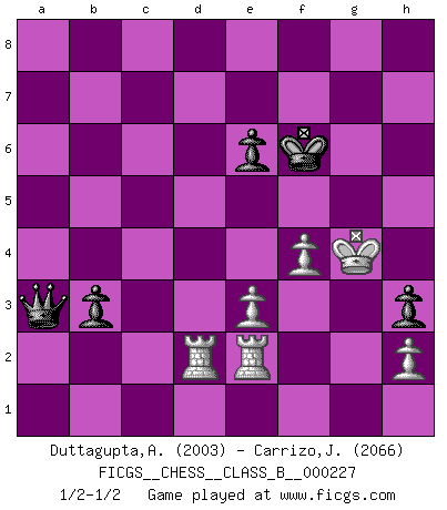 Last move : 1/2-1/2 2015 November 15 6:42:12 [Event "FICGS__CHESS__CLASS_B__000227"] [Site "FICGS"] [Date "2015.07.02"] [Round "1"] [White "Duttagupta,Aniruddha"] [Black "Carrizo,Jose"] [Result "1/2-1/2"] [WhiteElo "2003"] [BlackElo "2066"] 1.c4 e6 2.Nf3 d5 3.g3 dxc4 4.Qa4+ Nd7 5.Qxc4 a6 6.Bg2 b5 7.Qc6 Rb8 8.Qc2 Bb7 9.O-O c5 10.a4 Ngf6 11.axb5 axb5 12.Nc3 Qb6 13.d3 Bd6 14.Ne4 Nxe4 15.dxe4 O-O 16.Rd1 Ne5 17.Nxe5 Bxe5 18.Be3 Rbc8 19.f4 Bd4 20.Bxd4 cxd4 21.Qd3 Rfd8 22.e5 Rc3 23.bxc3 dxc3 24.e3 Rxd3 25.Rxd3 Bxg2 26.Rxc3 g5 27.Kxg2 Qd8 28.Kg1 Qd2 29.Rb3 gxf4 30.gxf4 h5 31.Rab1 h4 32.R1b2 Qd1+ 33.Kg2 Qg4+ 34.Kf2 h3 35.Re2 Qg2+ 36.Ke1 Qd5 37.Rb4 Kg7 38.Rd4 Qh1+ 39.Kd2 Qa1 40.Kd3 Qa3+ 41.Ke4 f5+ 42.exf6+ Kxf6 43.Kf3 b4 44.Kg4 b3 45.R4d2 1/2-1/2 English Opening : Agincourt variation Kingside Castling by player White (move 9) Kingside Castling by player Black (move 15) This chess game ended in a draw. Follow this game move after move (download)Who is your opponent tonight, tonight I am playing against the Black pieces. (Akiba Rubinstein) Zu meiner Zeit war ein 20 jähriger ein junger Spieler, heute ist er ein Veteran. (Garry Kasparov) Un jugador que trata de regresar una movida en el Ajedrez es un futuro carterista. (Richard Fenton) Je fais ceci parce que dans cinquante coups j'obtiendrai cela; je m'appelle Mikhail Moisevitch Botvinnik. (Botvinnik) For to win one hundred victories in one hundred battles is not the acme of skill. To subdue the enemy without fighting is the acme of skill. (Sun Tzu)