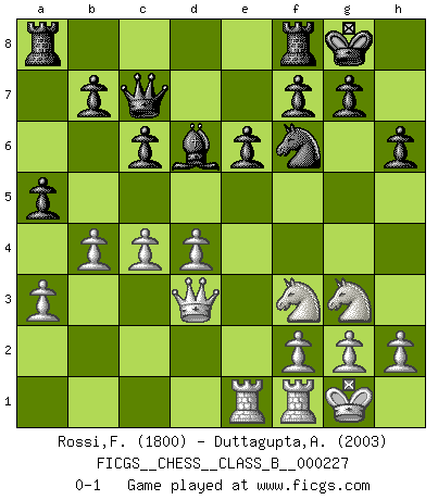 Last move : 0-1 2015 September 25 11:27:22 [Event "FICGS__CHESS__CLASS_B__000227"] [Site "FICGS"] [Date "2015.07.02"] [Round "1"] [White "Rossi,Franco"] [Black "Duttagupta,Aniruddha"] [Result "0-1"] [WhiteElo "1800"] [BlackElo "2003"] 1.e4 c6 2.d4 d5 3.Nc3 dxe4 4.Nxe4 Bf5 5.Ng3 Bg6 6.Nf3 Nd7 7.Bd3 e6 8.a3 Ngf6 9.O-O Bd6 10.c4 Bxd3 11.Qxd3 O-O 12.Bg5 Qc7 13.Rae1 h6 14.Bxf6 Nxf6 15.b4 a5 0-1 Caro-Kann : Classical variation Kingside Castling by player White (move 9) Kingside Castling by player Black (move 11) Player Black won this chess game. Follow this game move after move (download)A great player and a great example for many. His book My 60 Memorable Games had a big impact on me. It is a shame he didn't continue to enrich the world of chess with his unparalleled understanding after 1972. (Jan Timman, about Bobby Fischer's death) Schach ist ein Teil der Kultur, und wenn es mit der Kultur abwärts geht, geht es auch mit dem Schach abwärts. (Mikhail Moiseyevich Botvinik) Las combinaciones han sido siempre el aspecto más intrigante del Ajedrez. Los Maestros las buscan, el público las aplauden, los críticos las alaban. La razón se debe a que las combinaciones hacen posible que el Ajedrez sea más que un ejercicio matemático con una carencia de vida. Ellas son la poesía del juego, son del Ajedrez lo que la melodía es de la música. Ellas representan el triunfo de la mente sobre la materia. (Reuben Fine) Nous sommes les pions de la mystérieuse partie d'Echecs jouée par Dieu. Il nous déplace, nous arrête, nous pousse encore, puis nous lance un à un dans la boîte du Néant. Epitaphe sur la tombe de David Janowsky (1868-1927). They misunderestimated me. (George W. Bush, Bentonville nov. 6, 2000)