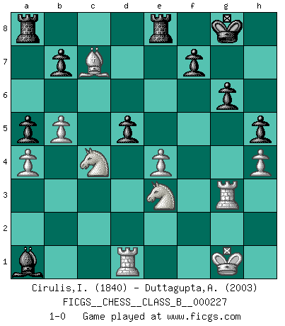 Last move : 1-0 2015 November 24 19:25:51 [Event "FICGS__CHESS__CLASS_B__000227"] [Site "FICGS"] [Date "2015.07.02"] [Round "1"] [White "Cirulis,Ilmars"] [Black "Duttagupta,Aniruddha"] [Result "1-0"] [WhiteElo "1840"] [BlackElo "2003"] 1.b4 e5 2.a3 g6 3.e3 Bg7 4.Bb2 d6 5.c4 Nf6 6.d3 O-O 7.Nf3 Nc6 8.Nbd2 a5 9.b5 Nb8 10.Be2 Re8 11.a4 Nbd7 12.O-O Nc5 13.d4 exd4 14.exd4 Nh5 15.g3 Bg4 16.Re1 Ne6 17.Nf1 Nf6 18.Ra3 Ne4 19.Re3 Nf6 20.h4 h6 21.Qa1 d5 22.Ne5 Bxe2 23.R3xe2 dxc4 24.Nd2 Qd5 25.Ndxc4 h5 26.Ne3 Qd6 27.d5 Nc5 28.N5c4 Qd8 29.Rd1 Nce4 30.d6 cxd6 31.f3 Nxg3 32.Rg2 d5 33.Rxg3 Qc7 34.Be5 Ne4 35.Bxc7 Bxa1 36.fxe4 1-0 Polish (Sokolsky) opening Kingside Castling by player Black (move 6) Kingside Castling by player White (move 12) Player White won this chess game. Follow this game move after move (download)It is difficult to play against Einstein's theory --on his first loss to Fischer. (Mikhail Tal) Garry Kasparov war erst in der Großmeister-Organisation GMA, dann in der Profischach-Vereinigung PCA, zum Schluss kehrte er wieder in den Schoß der FIDE zurück. Aber gut, manche Leute sind flexibel (Viswanathan Anand) Un entendimiento a fondo de las continuaciones típicas del mate, hace de las combinaciones de sacrificio mas complicadas conducirlas a ellas no solo sin dificultad, sino casi de una manera natural. (Siegbert Tarrasch) Je ne suis pas le dernier à jouer lâchement des coups douteux pendant le zeïtnot de l'adversaire pour l'achever: en effet les coups qui font le plus peur sont ceux que l'on ne comprend pas. Je me fais souvent peur quand je joue. (Un professeur anonyme) It is not enough to be a good player... you must also play well. (Siegbert Tarrasch)