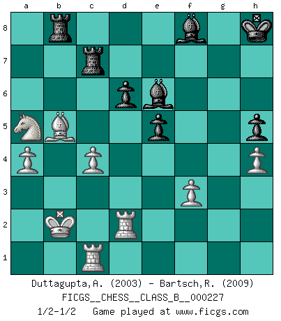 Last move : 1/2-1/2 2015 July 22 10:6:8 [Event "FICGS__CHESS__CLASS_B__000227"] [Site "FICGS"] [Date "2015.07.02"] [Round "1"] [White "Duttagupta,Aniruddha"] [Black "Bartsch,Reinhard Andrea"] [Result "1/2-1/2"] [WhiteElo "2003"] [BlackElo "2009"] 1.e4 c5 2.Nf3 d6 3.d4 cxd4 4.Nxd4 Nf6 5.Nc3 a6 6.Be3 e5 7.Nb3 Be6 8.h3 Nbd7 9.g4 b5 10.g5 b4 11.gxf6 bxc3 12.fxg7 Bxg7 13.bxc3 Qc7 14.Qd3 O-O 15.Rg1 Kh8 16.O-O-O Rfc8 17.Qd2 a5 18.a4 Qxc3 19.Qxc3 Rxc3 20.Kb2 Rac8 21.Bd3 R3c7 22.Rd2 Bf8 23.f3 h6 24.Ra1 Rb8 25.Bb5 f5 26.exf5 Bxf5 27.c4 Nb6 28.Rc1 Be6 29.Bxb6 Rxb6 30.Nxa5 Rb8 31.h4 h5 1/2-1/2 Sicilian : Najdorf, Byrne (English) attack Kingside Castling by player Black (move 14) Queenside Castling by player White (move 16) This chess game ended in a draw. Follow this game move after move (download)The way he plays Chess demonstrates a man's whole nature. (Stanley Ellin) Man braucht nicht immer den besten Zug zu spielen: Ein Zug muß aktiv, unternehmungslustig, korrekt und schön sein. (David Bronstein) El Ajedrez demanda una total concentración. (Bobby Fischer) Aux échecs, l'amour-propre est satisfait quand on remporte la victoire, mais il n'y a pas de honte à être battu. (Benjamin Franklin) A woman without a man is like a fish without a bicycle. (Gloria Steinem)