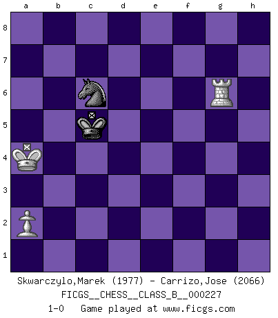 Last move : 1-0 2015 December 18 12:26:25 [Event "FICGS__CHESS__CLASS_B__000227"] [Site "FICGS"] [Date "2015.07.02"] [Round "1"] [White "Skwarczylo,Marek"] [Black "Carrizo,Jose"] [Result "1-0"] [WhiteElo "1977"] [BlackElo "2066"] 1.d4 d5 2.c4 e6 3.Nc3 c6 4.e4 dxe4 5.Nxe4 Bb4+ 6.Bd2 Qxd4 7.Bxb4 Qxe4+ 8.Ne2 Na6 9.Bf8 Ne7 10.Bxg7 Nb4 11.Qd6 Nd3+ 12.Kd2 Nf5 13.Qxd3 Qxd3+ 14.Kxd3 Nxg7 15.Kc3 b6 16.g4 Bb7 17.Bg2 O-O-O 18.Rad1 h5 19.g5 c5 20.Bxb7+ Kxb7 21.h4 Nf5 22.Ng3 Nd4 23.b3 Rd7 24.Kb2 Kc6 25.f4 Nf3 26.Rxd7 Kxd7 27.Kc3 Ke7 28.Kd3 Nd4 29.b4 Rd8 30.Kc3 cxb4+ 31.Kxb4 Rc8 32.Nxh5 a5+ 33.Kc3 Nb5+ 34.Kd3 Rd8+ 35.Kc2 Rc8 36.Nf6 Nd6 37.h5 Nxc4 38.h6 Kf8 39.Kd3 b5 40.g6 fxg6 41.h7 Kg7 42.Ng8 Rxg8 43.hxg8Q+ Kxg8 44.Kd4 Kf7 45.Kc5 Na3 46.Kb6 a4 47.Kc5 Kf6 48.Kb4 Nc2+ 49.Kxb5 a3 50.Ka4 e5 51.fxe5+ Kxe5 52.Rg1 Kd5 53.Kb3 Nd4+ 54.Kxa3 Nc6 55.Rxg6 Kc5 56.Ka4 1-0 QGD : Semi-Slav, Marshall gambit Queenside Castling by player Black (move 17) Promotion Queen by player White (move 43) 10 pieces endgame at move 43 : White KRPP , Black KNPPPP WHITE : King + 1 Rook 2 Pawns BLACK : King + 1 Knight 4 Pawns 9 pieces endgame at move 49 : White KRPP , Black KNPPP WHITE : King + 1 Rook 2 Pawns BLACK : King + 1 Knight 3 Pawns 8 pieces endgame at move 51 : White KRPP , Black KNPP WHITE : King + 1 Rook 2 Pawns BLACK : King + 1 Knight 2 Pawns 7 pieces endgame at move 51 : White KRP , Black KNPP WHITE : King + 1 Rook 1 Pawn BLACK : King + 1 Knight 2 Pawns 6 pieces endgame at move 54 : White KRP , Black KNP WHITE : King + 1 Rook 1 Pawn BLACK : King + 1 Knight 1 Pawn 5 pieces endgame at move 55 : White KRP , Black KN WHITE : King + 1 Rook 1 Pawn BLACK : King + 1 Knight Player White won this chess game. Follow this game move after move (download)Chess is a beautiful mistress. (Bent Larsen) Man gibt nur Pakete auf. (Paul Keres) No es una movida, aún la mejor movida que tu debas buscar, sino un plan comprensible. (Eugene Znosko-Borovsky) Mon pion favori sur ma case favorite ! Bronstein en parlant d'un coup de pion en h5 quand il avait les Noirs. I think your argument is specious - I think your tie is ugly. (Gregory House to Dr. Foreman, House M.D.)
