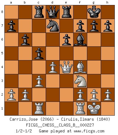 Last move : 1/2-1/2 2015 July 17 2:30:41 [Event "FICGS__CHESS__CLASS_B__000227"] [Site "FICGS"] [Date "2015.07.02"] [Round "1"] [White "Carrizo,Jose"] [Black "Cirulis,Ilmars"] [Result "1/2-1/2"] [WhiteElo "2066"] [BlackElo "1840"] 1.e4 c6 2.d4 d5 3.Nc3 e6 4.Nf3 Bb4 5.Bd3 dxe4 6.Bxe4 Nd7 7.O-O Ngf6 8.Bd3 O-O 9.Bf4 b6 10.Ne4 Bb7 11.c3 Be7 12.Qe2 c5 13.Nxf6+ Bxf6 14.Rac1 Rc8 15.Be4 Bxe4 16.Qxe4 Re8 1/2-1/2 Caro-Kann defense Kingside Castling by player White (move 7) Kingside Castling by player Black (move 8) This chess game ended in a draw. Follow this game move after move (download)Excellence at Chess is one mark of a scheming mind. (Sir Arthur Conan Doyle) Es gibt Leute, die glauben, alles wäre vernünftig, was man mit einem ernsthaften Gesicht tut. (Georg Christoph Lichtenberg) Cuando tengas duda... ¡juega al Ajedrez!. (Tevis) Tous ces prétendus hommes politiques sont les pions, les Cavaliers, les Tours ou les Fous d'une partie d'échecs qui se jouera tant qu'un hasard ne renversera pas l'échiquier. (Honoré de Balzac) He who defends everything defends nothing. (Frederick the Great)