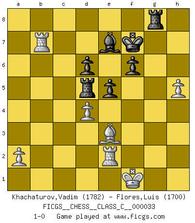 Last move : 1-0 2007 September 9 1:33:23 [Event "FICGS__CHESS__CLASS_C__000033"] [Site "FICGS"] [Date "2007.03.07"] [Round "1"] [White "Khachaturov,Vadim"] [Black "Flores,Luis"] [Result "1-0"] [WhiteElo "1782"] [BlackElo "1700"] 1.e4 c5 2.Nf3 d6 3.d4 cxd4 4.Nxd4 Nf6 5.Nc3 a6 6.Bc4 e6 7.O-O Be7 8.Bb3 O-O 9.f4 Qc7 10.f5 e5 11.Nde2 Nbd7 12.Be3 b5 13.Nd5 Nxd5 14.Bxd5 Bb7 15.Nc3 Nf6 16.Bxb7 Qxb7 17.Qd3 b4 18.Nd5 Nxd5 19.exd5 Rfc8 20.Rf2 Qb5 21.Rd1 Rc4 22.b3 Rc7 23.Bd2 Qxd3 24.cxd3 a5 25.Be3 Rc3 26.Re2 a4 27.bxa4 Ra5 28.Rb1 Rxa4 29.d4 Rd3 30.Rc1 f6 31.Rc8+ Kf7 32.Rc7 Ke8 33.Rb7 Ra5 34.Rxb4 Rxd5 35.Rb8+ Kf7 36.Rb7 g6 37.g4 Ra3 38.fxg6+ hxg6 39.h4 Ra8 40.h5 gxh5 41.gxh5 Rg8+ 42.Kf1 1-0 Sicilian : Najdorf, Lipnitzky attack Kingside Castling by player White (move 7) Kingside Castling by player Black (move 8) Player White won this chess game. Follow this game move after move (download)The game of chess is the touchstone of the intellect. (Goethe) Es war undenkbar für die Behörden, dass ein sowjetischer Großmeister auf diese Art und Weise [Fischer-Taimanov 6:0] verliert, ohne dass es eine politischer Erklärung dafür gäbe. (Mark Taimanov) Evita las multitudes. Haz independientemente tu propio razonamiento. Trata de ser el jugador de Ajedrez, no la pieza de Ajedrez. (Ralph Charell) Le jeu d'échecs fait naître et fortifie en nous plusieurs qualités précieuses dans le cours de l'existence, telles que la prévoyance, la circonspection, la prudence, et la persévérance. (Benjamin Franklin - 1783, la morale des échecs) There is no instance of a country having benefited from prolonged warfare. (Sun Tzu)