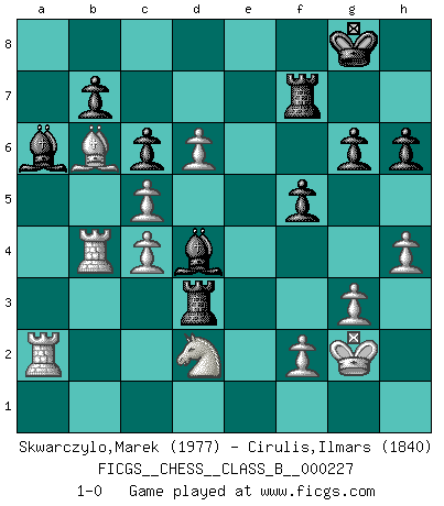 Last move : 1-0 2015 August 27 10:52:40 [Event "FICGS__CHESS__CLASS_B__000227"] [Site "FICGS"] [Date "2015.07.02"] [Round "1"] [White "Skwarczylo,Marek"] [Black "Cirulis,Ilmars"] [Result "1-0"] [WhiteElo "1977"] [BlackElo "1840"] 1.d4 c6 2.c4 d5 3.Nf3 Nf6 4.Qc2 g6 5.Bf4 Bf5 6.Qb3 Qb6 7.e3 Bg7 8.Nc3 O-O 9.Be2 Na6 10.O-O Qxb3 11.axb3 Nb4 12.Ra4 Nd3 13.Bxd3 Bxd3 14.Rd1 dxc4 15.Ne1 Nd5 16.bxc4 Nxc3 17.bxc3 Be2 18.Rda1 a6 19.c5 f6 20.Bc7 e5 21.Rb4 exd4 22.exd4 Ra7 23.Rb2 Bb5 24.d5 f5 25.Ra3 R7a8 26.d6 Rae8 27.Nf3 Rf7 28.Rb4 Bf6 29.h4 h6 30.c4 Re4 31.Nd2 Rd4 32.Ra2 a5 33.Bxa5 Ba6 34.g3 Rd3 35.Kg2 Bd4 36.Bb6 1-0 Queen's pawn Kingside Castling by player Black (move 8) Kingside Castling by player White (move 10) Player White won this chess game. Follow this game move after move (download)Chess is a terrible game. If you have no center, your opponent has a freer position. If you do have a center, then you really have something to worry about ! (Siegbert Tarrasch) Wenn ich einen Club besuche, sind die Spieler stumm vor Staunen. (José Raúl Capablanca) Algunos sacrificios son sólidos, los demás son míos. (Mikhail Tal) Aux échecs, les retours au sommet sont rares : les dommages psychologiques consécutifs à une défaite sont trop sévères. (Daily Telegraph) If computers get too powerful, we can organize them into committees. That'll do them in. (Anonymous)