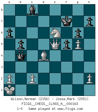 Last move : 1-0 2015 October 2 17:27:45 [Event "FICGS__CHESS__CLASS_A__000163"] [Site "FICGS"] [Date "2015.07.03"] [Round "1"] [White "Wilson,Norman"] [Black "Josse,Mark"] [Result "1-0"] [WhiteElo "2156"] [BlackElo "2051"] 1.e4 c5 2.Nf3 d6 3.d4 cxd4 4.Nxd4 Nf6 5.Nc3 a6 6.Bc4 e6 7.Bb3 Nbd7 8.g4 Nc5 9.Qe2 g6 10.g5 Nh5 11.Be3 b5 12.O-O-O Bb7 13.f4 Nxb3+ 14.Nxb3 Bg7 15.Rhe1 Qc7 16.Qf2 Bxc3 17.bxc3 O-O 18.Bb6 Qxc3 19.Rxd6 Rac8 20.Ba5 Qc4 21.Rd4 Qc6 22.Re3 f5 23.Bb4 Rfd8 24.Rc3 Qe8 25.Rxd8 Rxd8 26.exf5 exf5 27.Ba5 Rc8 28.Rxc8 Bxc8 29.Bc3 Qd8 30.Qe3 Kf7 31.Qa7+ Qd7 32.Qb6 Qe8 33.Kb2 Qe7 34.Qd4 Qf8 35.Nc5 Nxf4 36.Qf6+ Ke8 37.Qc6+ Kf7 38.Qc7+ Kg8 39.Qe5 Kf7 40.Bd4 Ne6 41.Nxe6 Qb4+ 42.Ka1 1-0 Sicilian : Najdorf, Lipnitzky attack Queenside Castling by player White (move 12) Kingside Castling by player Black (move 17) Player White won this chess game. Follow this game move after move (download)There are two types of sacrifices: correct ones and mine. (Mikhail Tal) Im Reiche der Wirklichkeit ist man nie so glücklich wie im Reiche der Gedanken. (Arthur Schopenhauer) Siempre es mucho mejor sacrificar las piezas de tu oponente. (Savielly Tartakover) La vérité est comme le meilleur coup aux échecs : elle existe, mais il faut la chercher. (Arturo Perez-Reverte) O divine art of subtlety and secrecy! Through you we learn to be invisible, through you inaudible and hence we can hold the enemy's fate in our hands. (Sun Tzu)