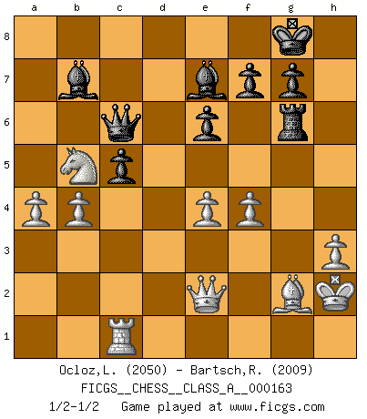 Last move : 1/2-1/2 2015 September 15 8:29:2 [Event "FICGS__CHESS__CLASS_A__000163"] [Site "FICGS"] [Date "2015.07.03"] [Round "1"] [White "Ocloz,Laurie"] [Black "Bartsch,Reinhard Andrea"] [Result "1/2-1/2"] [WhiteElo "2050"] [BlackElo "2009"] 1.e4 c5 2.Nf3 d6 3.d4 cxd4 4.Nxd4 Nf6 5.Nc3 a6 6.h3 e6 7.g4 b5 8.Bg2 Bb7 9.O-O Nfd7 10.a4 b4 11.Na2 a5 12.c3 Na6 13.cxb4 axb4 14.Bd2 h5 15.Nxb4 Nxb4 16.Bxb4 hxg4 17.Qxg4 Rh6 18.Nb5 Rg6 19.Qe2 Nc5 20.Kh1 Rc8 21.Bxc5 Rxc5 22.Rac1 Be7 23.f4 Qc8 24.Qd2 Qc6 25.Rxc5 dxc5 26.Rd1 Rg3 27.Rc1 Kf8 28.Kh2 Rg6 29.b4 Kg8 30.Qe2 1/2-1/2 Sicilian : Najdorf, Adams attack Kingside Castling by player White (move 9) This chess game ended in a draw. Follow this game move after move (download)I have never in my life played the French Defence, which is the dullest of all openings. (Wilhelm Steinitz) Gott hat gewollt, dass ich Champion werde. (Surab Azmajparaschvili) El Ajedrez era la lengua materna de Capablanca. (Reti) A chaque perte on perd un peu de soi. (Joël Lautier) I don't diet. I just don't eat as much as I'd like to. (Linda Evangelista, supermodel)