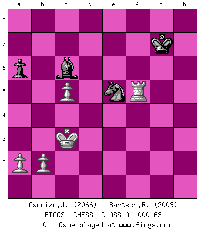 Last move : 1-0 2015 October 1 22:38:12 [Event "FICGS__CHESS__CLASS_A__000163"] [Site "FICGS"] [Date "2015.07.03"] [Round "1"] [White "Carrizo,Jose"] [Black "Bartsch,Reinhard Andrea"] [Result "1-0"] [WhiteElo "2066"] [BlackElo "2009"] 1.e4 c5 2.Nf3 d6 3.d4 cxd4 4.Nxd4 Nf6 5.Nc3 a6 6.Be3 e6 7.f3 b5 8.Qd2 Nbd7 9.g4 h6 10.O-O-O Bb7 11.h4 b4 12.Na4 d5 13.Bh3 dxe4 14.g5 hxg5 15.hxg5 exf3 16.Nxe6 fxe6 17.Bf5 exf5 18.Rxh8 Ng4 19.Nc5 Nxc5 20.Qxd8+ Rxd8 21.Rxd8+ Kxd8 22.Bxc5 Kd7 23.Rxf8 Be4 24.Kd2 Ke6 25.g6 Ne5 26.Re8+ Kd5 27.Bxb4 Ng4 28.Rd8+ Ke5 29.Bc5 Kf4 30.Rd7 f2 31.Bxf2 Nxf2 32.Rxg7 Kg5 33.Rg8 Kh6 34.c4 Ng4 35.c5 Ne5 36.g7 Bc6 37.Kc3 Kh7 38.Rf8 Kxg7 39.Rxf5 1-0 Sicilian : Najdorf, Byrne (English) attack Queenside Castling by player White (move 10) 10 pieces endgame at move 38 : White KRPPP , Black KBNPP WHITE : King + 1 Rook 3 Pawns BLACK : King + 1 Bishop 1 Knight 2 Pawns 9 pieces endgame at move 39 : White KRPPP , Black KBNP WHITE : King + 1 Rook 3 Pawns BLACK : King + 1 Bishop 1 Knight 1 Pawn Player White won this chess game. Follow this game move after move (download)Fischer Chess play was always razor-sharp, rational and brilliant. One of the best ever. (Dave Regis) Ich las kürzlich ein Buch von Nietzsche. Er sagte Religion verdumme nur die Menschen. Ich stimme zu. (Robert James Fischer) Algunos sacrificios son sólidos, los demás son míos. (Mikhail Tal) Tous ces prétendus hommes politiques sont les pions, les Cavaliers, les Tours ou les Fous d'une partie d'échecs qui se jouera tant qu'un hasard ne renversera pas l'échiquier. (Honoré de Balzac) A specialist learns more and more about less and less until he knows everything about nothing. (Nicholas Murray Butler)