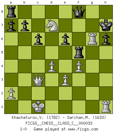 Last move : 1-0 2007 June 5 9:20:58 [Event "FICGS__CHESS__CLASS_C__000033"] [Site "FICGS"] [Date "2007.03.07"] [Round "1"] [White "Khachaturov,Vadim"] [Black "Sarihan,Mustafa"] [Result "1-0"] [WhiteElo "1782"] [BlackElo "1633"] 1.d4 Nf6 2.c4 e6 3.Nf3 d5 4.Nc3 Nbd7 5.Bg5 c6 6.e3 Qa5 7.Nd2 Bb4 8.Qc2 dxc4 9.Bxf6 Nxf6 10.Nxc4 Qg5 11.O-O-O O-O 12.h4 Qh6 13.Be2 Nd5 14.g4 Qf6 15.g5 Qd8 16.Bd3 Kh8 17.Bxh7 Bxc3 18.bxc3 Nxc3 19.Qxc3 Kxh7 20.Ne5 f6 21.gxf6 Rxf6 22.f4 Rf5 23.Rdg1 Qe7 24.h5 Bd7 25.h6 gxh6 26.Rg6 Qf8 27.Nxd7 1-0 Queen's pawn game Queenside Castling by player White (move 11) Kingside Castling by player Black (move 11) Player White won this chess game. Follow this game move after move (download)What would Chess be without silly mistakes ? (Kurt Richter) Die Jungen erwarten, dass Opa einfach umfällt. Dann aber kann Opa fünf Stunden lang Schach spielen und die jungen Gegner an die Wand drücken. (Viktor Kortschnoi) Estaba muy claro de que el punto vulnerable del Gran Maestro Americano (Bobby Fischer) radicaba en las posiciones de doble filo, colgantes, irracionales, donde el siempre falló en encontrar un triunfo aún en una posición de clara victoria. (Efim Geller) Le joueur d'Echecs qui veut atteindre le top est obligé de développer son propre credo créatif. Alexeï Stepanovicth Souétine. Il est facile d'écrire des livres ! Ce qui est difficile, c'est de jouer ! (Alexeï Stepanovicth Souétine) Programming can only do so much before it becomes too much. (Don Groves)