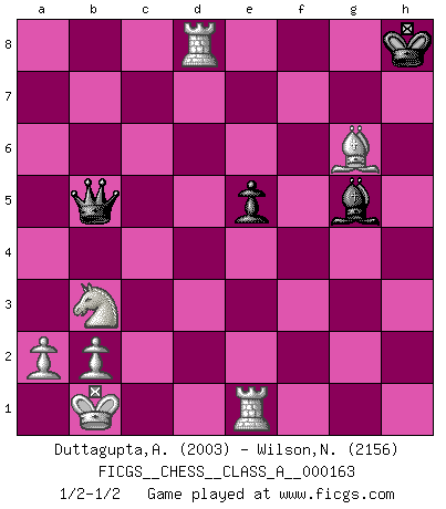 Last move : 1/2-1/2 2015 August 2 20:3:43 [Event "FICGS__CHESS__CLASS_A__000163"] [Site "FICGS"] [Date "2015.07.03"] [Round "1"] [White "Duttagupta,Aniruddha"] [Black "Wilson,Norman"] [Result "1/2-1/2"] [WhiteElo "2003"] [BlackElo "2156"] 1.e4 c5 2.Nf3 d6 3.d4 cxd4 4.Nxd4 Nf6 5.Nc3 Nc6 6.Bg5 e6 7.Qd2 Be7 8.O-O-O O-O 9.Nb3 a6 10.Bxf6 gxf6 11.f4 b5 12.Kb1 Kh8 13.g4 Rg8 14.Rg1 b4 15.Na4 Bd7 16.h4 Rb8 17.g5 Be8 18.Bxa6 Qc7 19.c4 bxc3 20.Nxc3 Nb4 21.Qd4 e5 22.Qf2 fxg5 23.fxe5 dxe5 24.Be2 f5 25.exf5 Rf8 26.hxg5 Rxf5 27.Qxf5 Bg6 28.Qxg6 hxg6 29.Nd2 Nd3 30.Bxd3 Qxc3 31.Nb3 Qc6 32.Rge1 Bxg5 33.Be4 Qb5 34.Bxg6 Rd8 35.Rxd8+ 1/2-1/2 Sicilian : Richter-Rauzer, Rauzer attack, 7...Be7 Queenside Castling by player White (move 8) Kingside Castling by player Black (move 8) This chess game ended in a draw. Follow this game move after move (download)Chess is mental torture. (Garry Kasparov) Pläne sind die Träume des Verständigen. (Ernst Freiherr von Feuchtersleben) Yo tuve un dolor de muelas en la primer partida. En el segundo juego, tuve un dolor de cabeza. En el tercero, tuve un ataque de reumatísmo. En la cuarta partida, no me sentía muy bien. ¿Y en el quinto juego? Bueno, ¿que acaso uno tiene que ganar todos los juegos?. (Siegbert Tarrasch) Les échecs c'est le défi de l'alpiniste, toujours plus haut, prêt à tout pour monter à l'assaut du Roi ennemi. Les échecs, c'est de la musique en mouvement, un ballet majestueux pour les yeux. C'est de la poésie composée par les fantômes du passé qui au même titre que Rimbaud ou Verlaine méritent notre admiration. Les échecs, c'est de la peinture ou le moindre mouvement modifie le tableau pour en faire un Picasso ou un Van Gogh. Les échecs, c'est tout et rien, c'est la vie et la mort. Jjulie33 sur le forum de France-Echecs. Treat your password like your toothbrush. Don't let anybody else use it, and get a new one every six months. (Clifford Stoll)