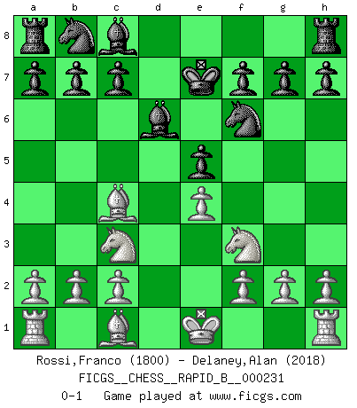Last move : 0-1 2015 August 22 9:25:41 [Event "FICGS__CHESS__RAPID_B__000231"] [Site "FICGS"] [Date "2015.07.03"] [Round "1"] [White "Rossi,Franco"] [Black "Delaney,Alan"] [Result "0-1"] [WhiteElo "1800"] [BlackElo "2018"] 1.e4 d6 2.d4 Nf6 3.Nc3 e5 4.dxe5 dxe5 5.Qxd8+ Kxd8 6.Nf3 Bd6 7.Bc4 Ke7 0-1 This chess game has been lost on time (started : 2015.07.03 14:36:27) Pirc defense Player Black won this chess game. Follow this game move after move (download)Becoming successful at Chess allows you to discover your own personality. That's what I want for the kids I teach. (Saudin Robovic) Der zweitbeste Zug ist oft der einzig richtige. (Savielly Grigorievitsch Tartakower) Las piezas de Ajedrez son los bloques del alfabeto que moldean los pensamientos; y esos pensamientos, aunque hagan un diseño visual en el tablero, expresan abstractamente su belleza como un poema. (Marcel Duchamp) Si rien de grave n'est détecté lors de l'analyse d'une position, on joue alors le coup. Seconde règle de Blumenfeld. Even the best needles are not sharp at both ends. (Chinese proverb)