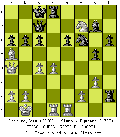Last move : 1-0 2015 August 27 20:21:33 [Event "FICGS__CHESS__RAPID_B__000231"] [Site "FICGS"] [Date "2015.07.03"] [Round "1"] [White "Carrizo,Jose"] [Black "Sternik,Ryszard"] [Result "1-0"] [WhiteElo "2066"] [BlackElo "1797"] 1.e4 c6 2.d4 d5 3.Nc3 dxe4 4.Nxe4 Bf5 5.Ng3 Bg6 6.h4 h6 7.Nf3 Nd7 8.h5 Bh7 9.Bd3 Bxd3 10.Qxd3 e6 11.Bf4 Qa5+ 12.Bd2 Qc7 13.O-O-O Ngf6 14.Ne4 O-O-O 15.g3 Nxe4 16.Qxe4 Nf6 17.Qe2 Rd5 18.c4 Rxh5 19.Rhe1 g5 20.Ne5 Rh2 21.Bc3 Bg7 22.Kb1 Re8 23.Qc2 Rd8 24.Qa4 a6 25.Ba5 b6 26.Nxf7 1-0 Caro-Kann : Classical, 7...Nd7 Queenside Castling by player White (move 13) Queenside Castling by player Black (move 14) Player White won this chess game. Follow this game move after move (download)If I win a tournament, I win it by myself. I do the playing. Nobody helps me. (Bobby Fischer) Ich würde die 30 stärksten Spieler der USA im Simultanspiel besiegen. (José Raúl Capablanca) Combinaciones deslumbrantes son para la mayoría, mover madera es para los pocos. (Georg Kieninger) Il vaut mieux sacrifier les pièces de l'adversaire. (Xavier Tartacover) Coffee just isn't my cup of tea. (Unknown)