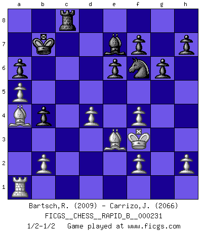 Last move : 1/2-1/2 2015 September 14 7:40:35 [Event "FICGS__CHESS__RAPID_B__000231"] [Site "FICGS"] [Date "2015.07.03"] [Round "1"] [White "Bartsch,Reinhard Andrea"] [Black "Carrizo,Jose"] [Result "1/2-1/2"] [WhiteElo "2009"] [BlackElo "2066"] 1.c4 e6 2.d4 d5 3.Nc3 c6 4.e3 Nf6 5.Nf3 Nbd7 6.Bd3 dxc4 7.Bxc4 b5 8.Bd3 a6 9.O-O c5 10.a4 b4 11.Ne4 Bb7 12.Nxf6+ Qxf6 13.Re1 Bxf3 14.Qxf3 Qxf3 15.gxf3 Be7 16.Be4 O-O-O 17.a5 Nf6 18.Bc6 Kc7 19.Ba4 cxd4 20.exd4 Kb7 21.Be3 Rc8 22.f4 g6 23.Kg2 Rhd8 24.Rec1 Nd5 25.Kf3 Rxc1 26.Rxc1 Rc8 27.Ra1 Nf6 1/2-1/2 English Opening Kingside Castling by player White (move 9) Queenside Castling by player Black (move 16) This chess game ended in a draw. Follow this game move after move (download)The tactician must know what to do whenever something needs doing; the strategist must know what to do when nothing needs doing. (Savielly Tartakover) Sie führen leise Selbstgespräche, schlürfen lautstark ihre Getränke, schmatzen hörbar beim Essen, blasen ihrem Gegenüber Rauch in die Augen, niesen ihm ins Gesicht, starren ihn unverwandt an, bis er sich unter ihren Blicken windet, rutschen ständig auf ihrem Stuhl hin und her, rülpsen und bohren in der Nase. (Anonymous) Tu no necesitas jugar muy bien, únicamente ayudar a tu oponenet a que juegue muy mal. (Genrikh Chepukaitis) Plusieurs personnes se sont demandées comment Tal faisait pour gagner... En fait, c'est très simple ! Il met ses pièces au centre de l'échiquier et les sacrifie quelque part ! (David Bronstein) The leaves of memory seemed to make a mournful rustling in the dark. (Henry Wadsworth Longfellow)