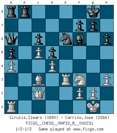 Last move : 1/2-1/2 2015 September 15 15:58:3 [Event "FICGS__CHESS__RAPID_B__000231"] [Site "FICGS"] [Date "2015.07.03"] [Round "1"] [White "Cirulis,Ilmars"] [Black "Carrizo,Jose"] [Result "1/2-1/2"] [WhiteElo "1840"] [BlackElo "2066"] 1.b4 d5 2.Nf3 Nf6 3.e3 Bf5 4.c4 e6 5.a3 c6 6.c5 Be7 7.Bb2 O-O 8.d4 Nbd7 9.Be2 b6 10.O-O a5 11.Nbd2 h6 12.Qc1 Qc7 13.h3 Rfb8 14.Re1 Ne4 15.Nxe4 Bxe4 16.Bc3 bxc5 17.bxc5 e5 18.a4 Bf6 19.Bd1 exd4 20.exd4 Nf8 21.Nd2 Bf5 22.Bc2 Qc8 23.Nf3 Bxc2 24.Qxc2 Qa6 25.Re3 Ne6 26.Rae1 Qb7 27.Ra1 Qa6 1/2-1/2 Polish (Sokolsky) opening Kingside Castling by player Black (move 7) Kingside Castling by player White (move 10) This chess game ended in a draw. Follow this game move after move (download)All that matters on the Chessboard is good moves. (Bobby Fischer) Wer nie einen Fehler gemacht hat, hat nie etwas Neues ausprobiert. (Albert Einstein) Si pudieramos observar el interior de la cabeza de un jugador de Ajedrez, encontraríamos ahí un mundo lleno de sentimientos, imágenes, ideas, emoción y pasión. (Alfred Binet) Le plus grand jeu de l'esprit jamais inventé, plus vous l'apprenez, plus vous y prenez du plaisir. (Garry Kasparov) The greatest con, that he ever pulled... was making you believe... that he is you. (Revolver, movie)