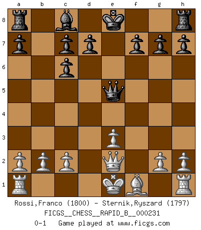 Last move : 0-1 2015 August 21 21:25:54 [Event "FICGS__CHESS__RAPID_B__000231"] [Site "FICGS"] [Date "2015.07.03"] [Round "1"] [White "Rossi,Franco"] [Black "Sternik,Ryszard"] [Result "0-1"] [WhiteElo "1800"] [BlackElo "1797"] 1.e4 e5 2.Nf3 Nc6 3.d4 exd4 4.Nxd4 Bc5 5.Nxc6 Qf6 6.Qe2 bxc6 7.Nd2 Qe6 8.Nf3 Nf6 9.e5 Ng4 10.Be3 Bxe3 11.fxe3 Nxe5 12.Nxe5 Qxe5 0-1 This chess game has been lost on time (started : 2015.07.03 14:36:27) Scotch game Player Black won this chess game. Follow this game move after move (download)I'm not afraid of Spassky. The world knows I'm the best. You don't need a match to prove it. (Bobby Fischer) Ohne Fehler kann es keine Brillanz geben. (Emanuel Lasker) Personalmente, yo prefiero mirar hacia el futuro en donde un programa de computadora gane el título mundial de Ajedrez. La humanidad necesita una lección de humildad. (Richard Dawkings) On est toujours la mazette de quelqu'un d'autre. (Anonyme) Luck is when opportunity knocks and you answer. (Anonymous)