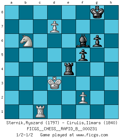 Last move : 1/2-1/2 2015 August 16 22:43:25 [Event "FICGS__CHESS__RAPID_B__000231"] [Site "FICGS"] [Date "2015.07.03"] [Round "1"] [White "Sternik,Ryszard"] [Black "Cirulis,Ilmars"] [Result "1/2-1/2"] [WhiteElo "1797"] [BlackElo "1840"] 1.d4 f5 2.g3 c5 3.d5 d6 4.Bg2 g6 5.Nh3 Bg7 6.Nf4 Nf6 7.h4 O-O 8.Nc3 b5 9.a3 Qe8 10.Bf3 Na6 11.h5 Nc7 12.hxg6 hxg6 13.a4 a6 14.axb5 axb5 15.Rxa8 Nxa8 16.b4 Nb6 17.bxc5 dxc5 18.d6 e6 19.Qd3 Nc4 20.g4 Ne5 21.Qe3 Nfxg4 22.Qxc5 Nxf3+ 23.exf3 Ne5 24.Nxb5 Nxf3+ 25.Kd1 Bb7 26.Ba3 Be4 27.Nc7 Qd7 28.Nfxe6 Qa4 29.Nd5 Rb8 30.Bc1 Re8 31.Nb6 Bxc2+ 32.Qxc2 Qxc2+ 33.Kxc2 Rxe6 34.Bf4 Ne1+ 35.Kd2 Nf3+ 36.Kd3 Ne5+ 37.Bxe5 Bxe5 38.d7 Bf6 39.Rb1 Re4 40.Rc1 1/2-1/2 Dutch defense Kingside Castling by player Black (move 7) 10 pieces endgame at move 37 : White KRNPP , Black KRBPP WHITE : King + 1 Rook 1 Knight 2 Pawns BLACK : King + 1 Rook 1 Bishop 2 Pawns This chess game ended in a draw. Follow this game move after move (download)Everything is in a state of flux, and this includes the world of Chess. (Mikhail Botvinnik) Es ist peinlich, dass ich nie Weltmeister wurde. Es wäre leicht, Leonid Breschnjew als Ursache vorzuschieben, dessen Apparat den Vorzeigekommunisten Anatoli Karpow in allem unterstützte. Aber Garri Kasparow zum Beispiel, der ebenfalls von den Sowjets unerwünscht war, hat trotz der Widerstände den WM-Titel erobert. (Viktor Kortschnoi) Fischer es una tragedia del Ajedrez Americano a la par con Morphy y Pillsbury. (Mig Greengard) Dieu déplace le joueur, et celui-ci la pièce. Quel Dieu derrière Dieu commence donc la trame ? Arturo Perez-Reverte (prix de littérature policière 1993). Only sick music makes money today. (Friedrich Nietzsche)