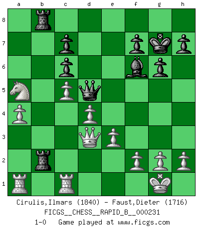 Last move : 1-0 2015 August 17 16:21:18 [Event "FICGS__CHESS__RAPID_B__000231"] [Site "FICGS"] [Date "2015.07.03"] [Round "1"] [White "Cirulis,Ilmars"] [Black "Faust,Dieter"] [Result "1-0"] [WhiteElo "1840"] [BlackElo "1716"] 1.b4 Nf6 2.e3 e5 3.a3 d5 4.Bb2 Bd6 5.c4 O-O 6.c5 Be7 7.Bxe5 a5 8.Nc3 Nc6 9.Bxf6 Bxf6 10.b5 d4 11.bxc6 dxc3 12.d4 bxc6 13.Rc1 Rb8 14.Bc4 Bf5 15.Nf3 Rb1 16.Bb3 Rb2 17.O-O Qd7 18.Rxc3 Rb8 19.Bc2 Bxc2 20.Rxc2 R2b3 21.Ra2 g6 22.Nd2 R3b5 23.Qc2 Kg7 24.Nc4 Qd5 25.a4 Rb4 26.Nxa5 Ra8 27.Qd2 Rab8 28.Rc1 Rb1 29.Ra1 R1b2 30.Qd3 1-0 Polish (Sokolsky) opening Kingside Castling by player Black (move 5) Kingside Castling by player White (move 17) Player White won this chess game. Follow this game move after move (download)You need not play well - just help your opponent to play badly. (Genrikh Chepukaitis) Ich verstehe den Grund nicht, warum die Aufteilung in Frauen und Männer überhaupt im Schach besteht. (Judith Polgar) Los tropiezos estan todos ahí en el tablero, esperando que se cometan. (Savielly Tartakover) Le génie consiste à savoir transgresser les règles au moment opportun. (Teichmann) The next best thing to gambling and winning is gambling and loosing. (Nick Dandalos)