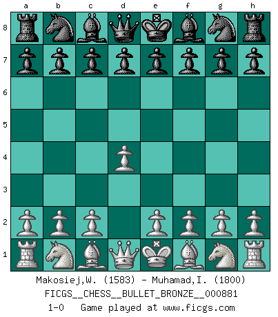 Last move : 1-0 2015 July 3 22:27:3 [Event "FICGS__CHESS__BULLET_BRONZE__000881"] [Site "FICGS"] [Date "2015.07.03"] [Round "1"] [White "Makosiej,Wladyslaw"] [Black "Muhamad,Idwar"] [Result "1-0"] [WhiteElo "1583"] [BlackElo "1800"] 1.d4 1-0 This chess game has been lost on time (started : 2015.07.03 20:49:38) Queen's pawn Player White won this chess game. Follow this game move after move (download)Your body has to be in top condition. Your Chess deteriorates as your body does. You can't separate body from mind. (Bobby Fischer) Wenn du gegen Bobby spielst, ist es keine Frage von gewinnen oder verlieren. Es ist eine Frage des Überlebens. (Boris Vassilievich Spassky) Combinaciones deslumbrantes son para la mayoría, mover madera es para los pocos. (Georg Kieninger) On n'a jamais que l'âge auquel on a commence à jouer aux échecs car après on cesse de vieillir. (Capablanca) You must do what you feel is right... of course. (Obi-Wan Kenobi in Star Wars ep.4)