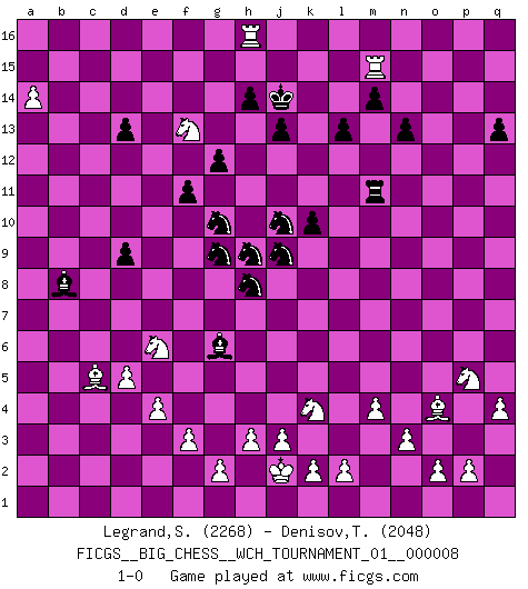 Last move : 1-0 2016 June 24 2:33:21 [Event "FICGS__BIG_CHESS__WCH_TOURNAMENT_01__000008"] [Site "FICGS"] [Date "2015.07.05"] [Round "1"] [White "Legrand,Stephane"] [Black "Denisov,Timofey"] [Result "1-0"] [WhiteElo "2268"] [BlackElo "2048"] 1.m2-m4 n15-n14 2.l1-o4 j15-h13 3.h2-g4 o16-g9 4.j2-k4 h16-q8 5.n2-n3 p16-o14 6.e2-e4 d15-d14 7.h1-l4 c16-p4 8.p1-o3 p4-k9 9.l4-b13 b16-c14 10.b13-b15 q8-j8 11.b15-b11 c14-e13 12.o1-k5 a16-b16 13.b11-p11 o14-m13 14.k5-l6 j8-j10 15.p11-p15 o15-o14 16.p15-p10 j10-p10 17.l6-p10 q16-p16 18.p10-l6 b16-b9 19.b1-c3 e13-g12 20.f1-b5 p16-p8 21.d2-d4 g12-j11 22.a2-a4 m13-k12 23.c1-f4 k12-j10 24.l6-m5 p8-o8 25.m1-m3 g16-j15 26.e1-e3 g15-g13 27.e3-f3 f16-g15 28.m3-l3 k16-l14 29.o3-p5 n14-n13 30.l3-l7 e16-f16 31.l7-o7 o8-g8 32.o7-o14 m15-m14 33.o14-o9 l14-k12 34.g4-f6 g8-g6 35.f6-e8 g9-h8 36.g1-e2 l16-q11 37.o9-p9 q11-m7 38.p5-n4 m7-l8 39.f3-g3 g6-g3 40.f4-g3 h8-m12 41.p9-o9 l8-m7 42.o9-q9 m7-p10 43.q9-q6 j10-h8 44.q6-c6 c15-c13 45.c6-a6 a15-a14 46.a6-a14 k12-j10 47.a14-a15 j15-g14 48.e8-d10 b9-b10 49.d10-c12 b10-f10 50.k1-h2 f16-h16 51.h2-g4 h15-j13 52.q2-q4 p10-k5 53.c12-e11 j16-j15 54.a1-a3 g15-d12 55.e11-d9 f10-c10 56.d9-b8 c10-e10 57.b8-d7 d12-g9 58.a3-b3 k15-k13 59.m5-d13 k5-g8 60.d4-d5 g8-h9 61.d13-h9 j11-h9 62.b5-c6 h13-j11 63.j1-h2 m16-p16 64.n4-p5 p16-p7 65.d7-c9 e10-e9 66.b3-b7 p7-b7 67.c9-b7 g14-h12 68.a4-a5 j13-k11 69.a5-a6 k11-j9 70.g4-f6 c13-c12 71.a15-a12 e9-e12 72.e2-f4 h12-g10 73.f6-e8 g9-h10 74.e8-d10 e12-e7 75.f4-e6 c12-c11 76.g3-d6 e7-b7 77.d6-h10 b7-b2 78.c6-a4 c11-d10 79.a4-b3 h16-c16 80.c3-a4 b2-c2 81.b3-c2 c16-c2 82.f2-f3 c2-c11 83.a12-a15 c11-e11 84.q1-c1 m12-k10 85.c1-c15 j11-g12 86.h10-c5 g12-e13 87.c15-e15 l15-l13 88.e15-e16 e11-h11 89.a6-a7 j15-k14 90.c5-b6 j14-j13 91.a15-a16 k13-k12 92.a7-a8 g13-g12 93.a8-a9 k10-j11 94.e16-m16 k14-l15 95.a9-a10 k12-k11 96.m16-b16 e13-f11 97.b16-h16 l15-k14 98.a10-a11 f15-f13 99.b6-c5 f11-g9 100.a4-b6 k11-k10 101.b6-c8 d10-d9 102.c8-b10 k9-g6 103.a16-a15 q15-q13 104.a11-a12 j11-g13 105.a12-a13 g13-c9 106.b10-c12 d14-d13 107.c12-d14 f13-f12 108.d14-f13 f12-f11 109.a15-h15 k14-j14 110.h15-m15 h11-m11 111.a13-a14 c9-b8 112.h2-j2 1-0 Follow this game move after move (download)The battle for the ultimate truth will never be won. And that's why Chess is so fascinating. (Hans Kmoch) Es ist peinlich, dass ich nie Weltmeister wurde. Es wäre leicht, Leonid Breschnjew als Ursache vorzuschieben, dessen Apparat den Vorzeigekommunisten Anatoli Karpow in allem unterstützte. Aber Garri Kasparow zum Beispiel, der ebenfalls von den Sowjets unerwünscht war, hat trotz der Widerstände den WM-Titel erobert. (Viktor Kortschnoi) La última cosa en que Fischer estaba interesado era en tonterías, siempre y cuando el Ajedrez estuviera involucrado. (Elie Agur) Karpov est une pièce de musée. (Garry Kasparov) Now be brave and don't look back. Don't look back. (Shmi Skywalker in Star Wars ep.1)