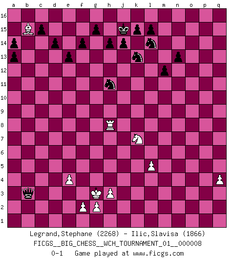 Last move : 0-1 2016 March 7 14:12:3 [Event "FICGS__BIG_CHESS__WCH_TOURNAMENT_01__000008"] [Site "FICGS"] [Date "2015.07.05"] [Round "1"] [White "Legrand,Stephane"] [Black "Ilic,Slavisa"] [Result "0-1"] [WhiteElo "2268"] [BlackElo "1866"] 1.m2-m4 j15-k13 2.p1-o3 e15-e13 3.b1-c3 m15-m13 4.e2-e4 b16-c14 5.j2-k4 h16-o10 6.h2-g4 l16-p12 7.k1-h2 p16-o14 8.f1-b5 f16-b12 9.h1-l4 g16-j15 10.d2-d3 m16-m14 11.g1-j2 m14-l14 12.l4-f9 h15-g13 13.l1-p5 k16-h15 14.c1-l9 n15-n14 15.n2-n3 d15-d14 16.f9-b9 j15-g14 17.o1-b13 a15-a13 18.e1-e3 o16-h10 19.e3-f3 h10-f12 20.a1-e1 q16-m16 21.b9-g9 o10-l13 22.l9-j11 l13-m12 23.j11-k10 m12-l13 24.g9-j7 g14-j13 25.j7-p13 m13-m12 26.p13-p15 l13-o13 27.p15-q14 g13-h11 28.k10-l9 j16-j15 29.f3-f6 n14-n13 30.f6-o6 o13-p14 31.q14-q12 m16-m14 32.o6-o7 c16-f13 33.b5-c4 f13-g14 34.o7-p7 q15-q13 35.b13-g8 m14-m15 36.m1-m3 o14-n12 37.m3-l3 h11-j9 38.g8-f9 j13-k11 39.l9-n7 o15-o13 40.n7-q10 l14-l3 41.j2-l3 p14-m14 42.q12-k6 h15-j13 43.f9-j6 a16-a14 44.j6-a14 b15-a14 45.k6-j6 p12-j6 46.k4-j6 j13-l14 47.q10-l5 m14-q14 48.c4-h9 c14-d12 49.j1-j2 m15-p15 50.p7-q7 e16-p16 51.q2-q4 p15-p7 52.q7-q9 p7-b7 53.h9-b3 p16-p10 54.e1-e3 j9-k7 55.q9-q7 g14-h13 56.l5-n7 n12-m10 57.e3-f3 m10-l8 58.n7-o6 k11-j9 59.o3-n5 k7-m6 60.q7-b7 h13-b7 61.o6-l9 q14-o16 62.q1-q3 b7-h13 63.n5-l6 h13-o7 64.h2-k3 j9-k7 65.l9-e3 d12-e14 66.n3-n4 f15-f14 67.q3-o3 o7-q5 68.o3-o8 l8-k6 69.f3-f9 f12-g13 70.f9-q9 g13-p5 71.q9-q5 p5-l9 72.e3-l9 k7-l9 73.p2-p3 p10-p13 74.q5-q9 l9-m7 75.o8-q8 o16-d6 76.j6-l5 m7-l5 77.m4-l5 k6-l4 78.l6-m8 b12-l3 79.k2-l3 m6-n4 80.k3-h4 n4-o2 81.b3-j10 e14-f12 82.p3-p4 o2-p4 83.q9-q13 d6-p6 84.q13-p13 p6-p13 85.j10-n6 p4-n3 86.q8-p8 p13-c1 87.j2-h2 c1-b2 88.c3-d5 b2-c2 89.p8-o8 c2-d3 90.n6-k9 d3-b1 91.k9-o13 b1-l1 92.o13-g6 n3-l2 93.h2-g3 l2-j3 94.g4-j3 l4-j3 95.g3-f3 l1-l3 96.m8-k7 l3-k4 97.g6-j8 k4-h4 98.d5-f4 j3-h5 99.f4-h5 h4-h5 100.f3-e3 f12-h11 101.j8-b15 h5-g5 102.e3-f3 g5-f6 103.f3-g3 f6-g6 104.g3-f3 g6-f7 105.f3-g3 f7-a2 106.o8-h8 a2-b3 0-1 Follow this game move after move (download)It is not a move, even the best move that you must seek, but a realizable plan. (Eugene Znosko-Borovsky) Kasparov ist eine Art Monster mit hundert Augen, denen auch nicht das Geringste entgeht. (Tony Miles) El poder defensivo de una pieza clavada, solamente es imaginario. (Aaron Nimzovich) Aucun coup ne doit être joué sans but. (Pedro Damiano) The hypothalamus is one of the most important parts of the brain, involved in many kinds of motivation, among other functions. The hypothalamus controls the 'Four Fs: Fighting, Fleeing, Feeding and Mating. (Unknown author)