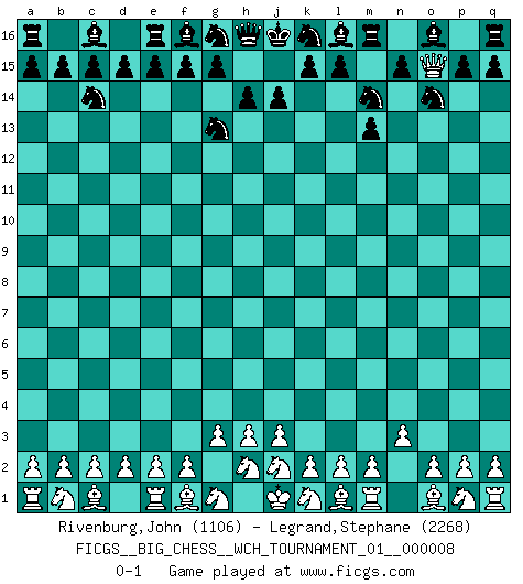 Last move : 0-1 2015 August 11 20:24:4 [Event "FICGS__BIG_CHESS__WCH_TOURNAMENT_01__000008"] [Site "FICGS"] [Date "2015.07.05"] [Round "1"] [White "Rivenburg,John"] [Black "Legrand,Stephane"] [Result "0-1"] [WhiteElo "1106"] [BlackElo "2268"] 1.g2-g3 m15-m13 2.h1-c6 b16-c14 3.c6-c12 h15-g13 4.c12-o12 j15-k13 5.o12-o15 p16-o14 6.n2-n3 k13-m14 0-1 This big chess game has been lost on time (started : 2015.07.05 16:4:55) Follow this game move after move (download)It is peculiar but a fact nevertheless, that gamblers in chess always have enthusiastic followers. (Botvinnik) Wenn man heute mit 14 Jahren noch kein GM ist, kann man es vergessen. (Viswanathan Anand) A través de las casillas del tablero, los Indios explican el movimiento del tiempo y la edad, las influencias mas altas que controlan el mundo y los lazos que vinculan al Ajedrez con el alma humana. (Al-Masudi) Il a essayé de se convaincre qu'il pourrait empêcher toutes les erreurs et ne jamais perdre. L'horreur ! Gary Kasparov au sujet de Robert Fischer. He is a liar. I just don't know what the lie is yet. (Horatio Caine, C.S.I. Miami)