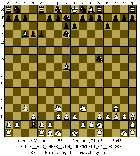 Last move : 0-1 2015 September 22 19:19:14 [Event "FICGS__BIG_CHESS__WCH_TOURNAMENT_01__000008"] [Site "FICGS"] [Date "2015.07.05"] [Round "1"] [White "Aahlad,Yeturu"] [Black "Denisov,Timofey"] [Result "0-1"] [WhiteElo "1456"] [BlackElo "2048"] 1.c2-c4 d15-d13 2.j2-k4 j15-h13 3.h1-o7 n15-n14 4.m2-m3 h16-k14 5.l1-o4 c16-j10 6.d2-d3 o16-c5 7.h2-g4 p16-o14 8.c1-j7 e15-e13 9.p2-p3 k14-c7 10.g2-g3 c5-g9 11.o7-j12 c7-j7 12.o1-q3 j10-h9 13.j12-j7 g9-j7 14.o2-o3 f16-c13 15.n2-n3 o14-n12 16.k1-m2 n12-m10 17.b1-d2 j7-d2 0-1 Follow this game move after move (download)Personally, I rather look forward to a computer program winning the world Chess Championship. Humanity needs a lesson in humility. (Richard Dawkings) Im Internet Chess Club betrug mein Rating vorübergehend 3350 ELO-Punkte. (Sergej Karjakin) De eso se trata el Ajedrez. Un día le das una lección a tu oponente y al día siguiente el te da una a tí. (Bobby Fischer) Les Echecs ont trois composantes : le temps, l'espace et le matériel en dernier. (Mikhail Tal) However beautiful the strategy, you should occasionally look at the results. (Winston Churchill)