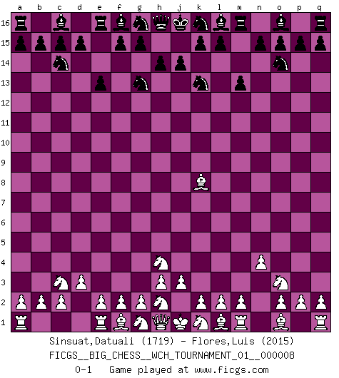 Last move : 0-1 2015 September 5 10:21:33 [Event "FICGS__BIG_CHESS__WCH_TOURNAMENT_01__000008"] [Site "FICGS"] [Date "2015.07.05"] [Round "1"] [White "Sinsuat,Datuali"] [Black "Flores,Luis"] [Result "0-1"] [WhiteElo "1719"] [BlackElo "2015"] 1.d2-d3 j15-k13 2.j2-h4 h15-g13 3.c1-k8 e15-e13 4.n2-n4 p16-o14 5.b1-c3 m15-m13 6.p1-o3 b16-c14 0-1 Follow this game move after move (download)Botvinnik tried to take the mystery out of Chess, always relating it to situations in ordinary life. He used to call Chess a typical inexact problem similar to those which people are always having to solve in everyday life. (Garry Kasparov) Im Wettkampf zwischen starken Meistern kommen Fehler sehr selten vor, deshalb ist es mit bloßem Warten nicht getan. (José Raúl Capablanca) No es suficiente ser un buen jugador, se debe también de jugar bién. (Siegbert Tarrasch) À la honte des hommes, on sait que les lois du jeu sont les seules qui soient partout justes, claires, inviolables et exécutées. Pourquoi l'Indien qui a donné les règles du jeu d'échecs est-il obéi de bon gré dans toute la terre, et que les décrétales des papes, par exemple, sont aujourd'hui un objet d'horreur et de mépris ? C'est que l'inventeur des échecs combina tout avec justesse pour la satisfaction des joueurs, et que les papes, dans leurs décrétales, n'eurent en vue que leur seul avantage. L'Indien voulut exercer également l'esprit des hommes et leur donner du plaisir; les papes ont voulu abrutir l'esprit des hommes. Voltaire (Dictionnaire philosophique / Garnier 1967) Without enthusiasm, virtue functions not at all, and vice only poorly. (Mignon McLaughlin, The Neurotic's Notebook, 1960)