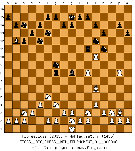 Last move : 1-0 2015 September 23 17:31:6 [Event "FICGS__BIG_CHESS__WCH_TOURNAMENT_01__000008"] [Site "FICGS"] [Date "2015.07.05"] [Round "1"] [White "Flores,Luis"] [Black "Aahlad,Yeturu"] [Result "1-0"] [WhiteElo "2015"] [BlackElo "1456"] 1.j2-k4 c15-c13 2.h2-g4 o15-o13 3.h1-o7 h15-g13 4.o7-o13 p16-q14 5.o13-o6 n15-n13 6.b1-c3 d15-d13 7.p1-o3 j15-k13 8.e2-e4 o16-j11 9.o6-p6 p15-p14 10.m2-m4 h16-o10 11.f1-c4 c16-o5 12.p6-b6 b15-b14 13.d2-d3 q14-p12 14.c1-k8 e15-e14 15.l1-o4 b16-c14 16.n2-n3 c13-c12 17.o1-g8 k16-l14 18.g1-j2 f16-a11 19.e1-e3 m16-o16 20.e3-f3 o10-o6 21.b6-b9 j16-j15 22.g8-j10 o16-o9 23.b9-b13 g16-e15 24.j10-o5 o6-o5 25.m1-m3 q16-o16 26.m3-l3 o16-o11 27.a1-e1 m15-m14 28.f3-f5 o5-m7 29.e1-e3 l16-o13 30.f5-l5 o13-g6 31.b13-b8 o9-d9 32.b8-b6 o11-o6 33.l5-l6 o6-l6 34.l3-l6 g6-j8 35.l6-j6 m7-h7 36.j6-j7 h7-h8 37.k4-j6 h8-f8 38.e3-f3 f8-d8 39.b6-d8 d9-d8 40.j6-g7 j8-g10 41.q1-m1 e16-o16 42.m1-m3 o16-o8 43.k8-m6 o8-p8 44.o4-p3 a16-o16 45.m3-k3 o16-o11 46.c4-m13 o11-l11 47.k1-l3 p12-n11 48.m13-b3 e15-f13 49.k3-k9 l14-m12 50.j7-q7 q15-q13 51.f3-f10 k13-h12 52.g7-e6 d8-g8 53.e6-d4 g13-e12 54.f10-a10 a11-b12 55.b3-g8 p8-g8 56.q7-p7 g10-j8 57.k9-k8 h12-f11 58.p7-p8 f11-g9 59.d4-f5 j11-l9 60.k8-l8 l9-m10 61.a10-m10 1-0 Follow this game move after move (download)Even the laziest King flees wildly in the face of a double check ! (Aaron Nimzowitsch) Du musst nicht gut spielen, es reicht, wenn du besser spielst als dein Gegner. (Anonymous) La señal de un Gran Maestro es su habilidad de ganar una partida rápidamente y sin dolor. (Irving Chernev) Les Echecs, c'est l'art de la guerre sans les charniers, c'est la résurrection des morts tombés au champ d'honneur, l'espoir perpétuel, la suprématie de l'intelligence sur la force, la culture de l'esprit. (F. Szpiner) Those who make the worst use of their time are the first to complain of its brevity. (Jean de la Bruyere)
