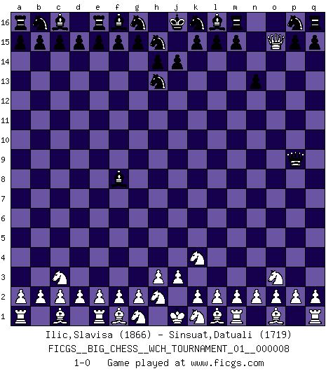 Last move : 1-0 2015 September 3 22:20:8 [Event "FICGS__BIG_CHESS__WCH_TOURNAMENT_01__000008"] [Site "FICGS"] [Date "2015.07.05"] [Round "1"] [White "Ilic,Slavisa"] [Black "Sinsuat,Datuali"] [Result "1-0"] [WhiteElo "1866"] [BlackElo "1719"] 1.j2-k4 n15-n13 2.h1-o7 j15-h13 3.o7-o15 h16-p9 4.p1-o3 o16-f8 5.b1-c3 1-0 This big chess game has been lost on time (started : 2015.07.05 16:4:55) Follow this game move after move (download)No Chess Grandmaster is normal; they only differ in the extent of their madness. (Viktor Korchnoi) Ich verlor meine Bürgerrechte, mein Gehalt wurde mir nicht mehr bezahlt und ich wurde zensiert und durfte nicht mehr ins Ausland reisen. [nach dem Match Fischer-Taimanov 6:0] (Mark Taimanov) No solamente yo pronostico su triunfo sobre Botvinnik, sino que me adelanto y digo que probablemente Fischer es el jugador de Ajedrez mas grande que haya existido. (John Collins) Avec des compensations pour le matériel en plus... (Anonyme) Only sick music makes money today. (Friedrich Nietzsche)