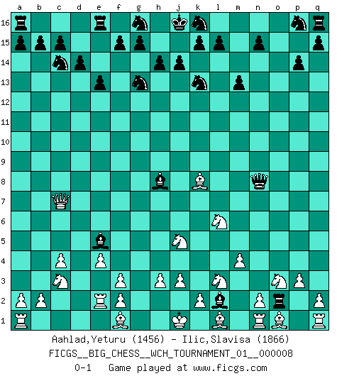 Last move : 0-1 2015 July 28 18:11:10 [Event "FICGS__BIG_CHESS__WCH_TOURNAMENT_01__000008"] [Site "FICGS"] [Date "2015.07.05"] [Round "1"] [White "Aahlad,Yeturu"] [Black "Ilic,Slavisa"] [Result "0-1"] [WhiteElo "1456"] [BlackElo "1866"] 1.c2-c4 j15-k13 2.h2-g4 h16-k14 3.e2-e4 p15-p14 4.p2-p3 o16-p15 5.j2-k4 m15-m13 6.h1-o7 h15-g13 7.o7-o15 k14-m12 8.o15-o4 e15-e13 9.p1-o3 m16-o16 10.o4-g11 l16-p12 11.g1-f3 o16-o11 12.g11-c7 b16-c14 13.d2-d4 f16-b12 14.c1-k8 m12-j12 15.k4-l6 d15-d14 16.o3-n5 o11-o2 17.n5-o3 b12-c13 18.k1-l3 c16-o5 19.m2-m4 o5-l2 20.m1-n1 j12-n8 21.g4-j5 p12-f3 22.g2-f3 p15-d4 23.e1-e2 c13-h8 24.b1-c3 d4-e5 0-1 Follow this game move after move (download)Not all artists are Chess players, but all Chess players are artists. (Marcel Duchamp) Im Leben werden Partien nie so unstrittig gewonnen wie im Spiel (Emanuel Lasker) Por esta medida (el intervalo entre Fischer y sus contemporaneos), yo le considero el mas grande campeón mundial. (Garry Kasparov) Roi des jeux et jeu des rois, les échecs portent en eux un sentiment d'infini. Ils donnent à celui qui s'est efforcé d'en approfondir les arcanes l'impression de n'être pas à la mesure de l'homme; en fait, ils constituent un résumé de l'univers, un microcosme, et figurent cette grande échelle qui, dans les plans de la lumière descend jusqu'à la matière, qui des abîmes insondables remonte jusqu'en l'infini de Dieu. (Pyrame) The hypothalamus is one of the most important parts of the brain, involved in many kinds of motivation, among other functions. The hypothalamus controls the 'Four Fs: Fighting, Fleeing, Feeding and Mating. (Unknown author)