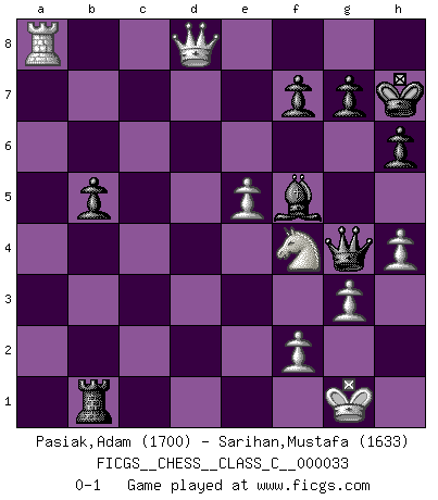 Last move : 0-1 2007 June 30 9:21:26 [Event "FICGS__CHESS__CLASS_C__000033"] [Site "FICGS"] [Date "2007.03.07"] [Round "1"] [White "Pasiak,Adam"] [Black "Sarihan,Mustafa"] [Result "0-1"] [WhiteElo "1700"] [BlackElo "1633"] 1.e4 c5 2.Nf3 Nc6 3.d4 cxd4 4.Nxd4 d6 5.Nc3 e5 6.Nf3 Nf6 7.Be2 Be7 8.O-O Be6 9.Bg5 O-O 10.Bxf6 Bxf6 11.Nd5 Bg5 12.Nxg5 Qxg5 13.c3 Rac8 14.g3 a6 15.Ne3 Rcd8 16.Qa4 Ne7 17.Rad1 d5 18.Rfe1 h6 19.Bf3 d4 20.cxd4 b5 21.Qxa6 exd4 22.Ng2 Ra8 23.Qb6 Rxa2 24.Nf4 Rxb2 25.h4 Qf6 26.e5 Qf5 27.Be4 Qg4 28.Rxd4 Nf5 29.Rd8 Rxd8 30.Qxd8+ Kh7 31.Ra1 Rb3 32.Bxf5+ Bxf5 33.Ra8 Rb1+ 0-1 Sicilian defense Kingside Castling by player White (move 8) Kingside Castling by player Black (move 9) Player Black won this chess game. Follow this game move after move (download)Don't even mention losing to me. I can't stand to think of it. (Bobby Fischer) Ich glaube, ich kenne inzwischen die Gründe für mein Versagen: schachliche Charakterfehler. Ich war nie ein Wunderkind und in meiner gesamten menschlichen Entwicklung immer zu langsam. (Viktor Kortschnoi) Fischer es el jugador mas fuerte del mundo. De hecho, el jugador mas fuerte que jamas haya existido. (Larry Evans) Seul un grand joueur sait à quel point il joue faiblement. (Xavier Tartacover) No, I am still playing. (Anatoly Karpov)