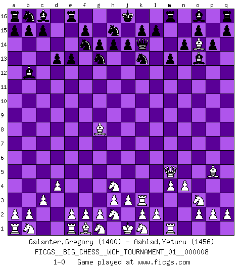 Last move : 1-0 2015 September 9 8:58:1 [Event "FICGS__BIG_CHESS__WCH_TOURNAMENT_01__000008"] [Site "FICGS"] [Date "2015.07.05"] [Round "1"] [White "Galanter,Gregory"] [Black "Aahlad,Yeturu"] [Result "1-0"] [WhiteElo "1400"] [BlackElo "1456"] 1.d2-d4 j15-k13 2.p1-o3 p15-p14 3.j2-h4 p16-o14 4.m2-m4 h16-m12 5.c2-c3 e15-e13 6.h1-o7 h15-g13 7.l1-p5 k16-h15 8.n2-n4 f16-b12 9.c1-l9 g15-g14 10.l9-k10 m12-k14 11.o1-g8 m15-m13 12.m1-m3 l16-o13 13.m3-k3 d15-d13 14.o7-m5 g16-f14 15.q1-m1 n15-n14 16.k10-o14 1-0 Follow this game move after move (download)Only the player with the initiative has the right to attack. (Wilhelm Steinitz) Wie gewinnt Tal? Er entwickelt alle seine Figuren in die Brettmitte und opfert sie dann irgendwo. (Robert James Fischer) No es suficiente ser un buen jugador, se debe también de jugar bién. (Siegbert Tarrasch) Les Echecs ont trois composantes : le temps, l'espace et le matériel en dernier. (Mikhail Tal) Perfection is achieved, not when there is nothing more to add, but when there is nothing left to take away. (Antoine de Saint-Exupéry)