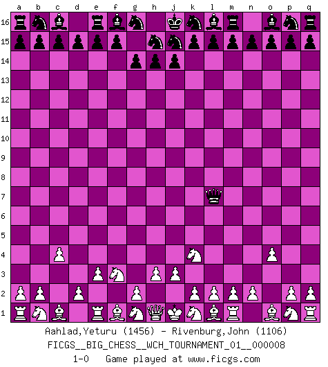 Last move : 1-0 2015 August 15 8:45:30 [Event "FICGS__BIG_CHESS__WCH_TOURNAMENT_01__000008"] [Site "FICGS"] [Date "2015.07.05"] [Round "1"] [White "Aahlad,Yeturu"] [Black "Rivenburg,John"] [Result "1-0"] [WhiteElo "1456"] [BlackElo "1106"] 1.c2-c4 g15-g14 2.o2-o4 h16-f14 3.e2-e3 f14-f2 4.h2-f3 f2-l7 5.j2-k4 1-0 This big chess game has been lost on time (started : 2015.07.05 16:4:55) Follow this game move after move (download)Chess is really ninety nine percent calculation. (Soltis) Jeder Schachmeister war einmal ein Anfänger. (Irving Chernev) Una de estas pequeñas movidas modestas pudieran ser mas molestas a tu oponente que la amenaza mas grande. (Siegbert Tarrasch) L'ordinateur a tué l'originalité. Il n'y a plus guère d'aventures sur l'échiquier. (Jacob Murray) When you stop learning you start dying. (Scott Adams)