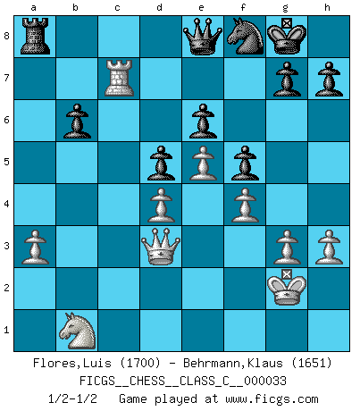 Last move : 1/2-1/2 2007 April 22 9:24:26 [Event "FICGS__CHESS__CLASS_C__000033"] [Site "FICGS"] [Date "2007.03.07"] [Round "1"] [White "Flores,Luis"] [Black "Behrmann,Klaus"] [Result "1/2-1/2"] [WhiteElo "1700"] [BlackElo "1651"] 1.d4 f5 2.c4 Nf6 3.Nc3 e6 4.Bg5 Be7 5.Nf3 O-O 6.g3 b6 7.Bg2 Ne4 8.Bxe7 Qxe7 9.Nd2 Nxc3 10.bxc3 c6 11.f4 Bb7 12.O-O Na6 13.e4 c5 14.e5 Bxg2 15.Kxg2 Rfd8 16.Qe2 Nc7 17.Rad1 cxd4 18.cxd4 Rac8 19.Qd3 Na6 20.a3 d5 21.c5 Nb8 22.cxb6 axb6 23.Rb1 Nd7 24.Rfc1 Rxc1 25.Rxc1 Ra8 26.Nb1 Qe8 27.Rc7 Nf8 28.h3 1/2-1/2 Dutch with c4 & Nc3 Kingside Castling by player Black (move 5) Kingside Castling by player White (move 12) This chess game ended in a draw. Follow this game move after move (download)The tactician knows what to do when there is something to do; whereas the strategian knows what to do when there is nothing to do. (Gerald Abrahams) Wie gewinnt Tal? Er entwickelt alle seine Figuren in die Brettmitte und opfert sie dann irgendwo. (Robert James Fischer) En un gambito tu regalas un Peón por el bién de tomar un juego perdido. (Samuel Standige Boden) Ne tendez aucun piège pour le plaisir ! Ne jouez rien dans l'espoir que l'adversaire réagisse de façon stupide ! Prenez toujours pour acquis que l'adversaire va trouver le meilleur coup ! Ne jouez jamais de coup dans l'espoir que l'adversaire ne voie pas la menace ! Chacun de vos coups doit améliorer la position d'une façon ou d'une autre. If you are going through hell, keep going. (Winston Churchill)