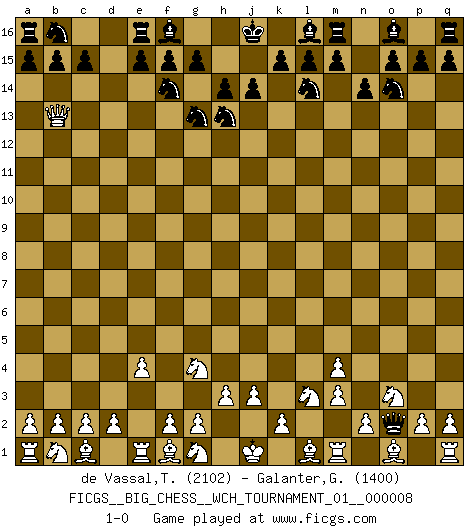 Last move : 1-0 2015 October 5 16:17:10 [Event "FICGS__BIG_CHESS__WCH_TOURNAMENT_01__000008"] [Site "FICGS"] [Date "2015.08.01"] [Round "1"] [White "de Vassal,Thibault"] [Black "Galanter,Gregory"] [Result "1-0"] [WhiteElo "2102"] [BlackElo "1400"] 1.j2-k4 p16-o14 2.h2-g4 j15-h13 3.h1-l4 k16-l14 4.l4-c12 d15-d13 5.c12-d13 h15-g13 6.m2-m4 g16-f14 7.d13-b13 h16-o10 8.e2-e4 o10-o2 9.p1-o3 c16-o5 10.k4-m3 o5-m3 11.l2-m3 n15-n14 12.k1-l3 1-0 Follow this game move after move (download)I love all positions. Give me a difficult positional game, I will play it. But totally won positions, I cannot stand them. (Hein Donner) Ich kenne keine einzige Person, die behaupten würde, Garri Kasparow sei ein guter Mensch (Nigel Short) Los errores estan ahí, esperando a que se cometan. (Savielly Tartakower) Le temps de noter son nom sur la feuille de partie, j'étais déjà en zeitnot ! D'un modeste amateur apparié lors de la première ronde d'un open contre le grand-maître Azmaïparashvili. Humor is by far the most significant activity of the human brain. (Edward De Bono)