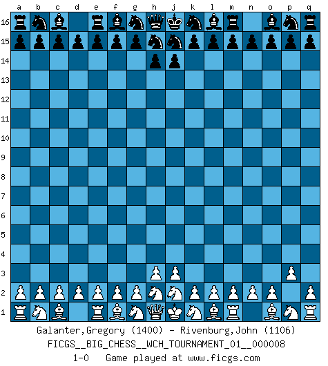 Last move : 1-0 2015 August 9 8:21:5 [Event "FICGS__BIG_CHESS__WCH_TOURNAMENT_01__000008"] [Site "FICGS"] [Date "2015.07.05"] [Round "1"] [White "Galanter,Gregory"] [Black "Rivenburg,John"] [Result "1-0"] [WhiteElo "1400"] [BlackElo "1106"] 1.p2-p3 1-0 This big chess game has been lost on time (started : 2015.07.05 16:4:55) Follow this game move after move (download)A great player and a great example for many. His book My 60 Memorable Games had a big impact on me. It is a shame he didn't continue to enrich the world of chess with his unparalleled understanding after 1972. (Jan Timman, about Bobby Fischer's death) Das Zentrum ist der Balkan des Schachbretts - Kriegshandlungen können in jedem Moment ausbrechen. (Aaron Nimzowitsch) Dejen al perfeccionista jugar por correo. (Yasser Seirawan) Les échecs, c'est l'imagination. (David Bronstein) The existence of forgetting has never been proved: We only know that some things don't come to mind when we want them. (Friedrich Nietzsche)