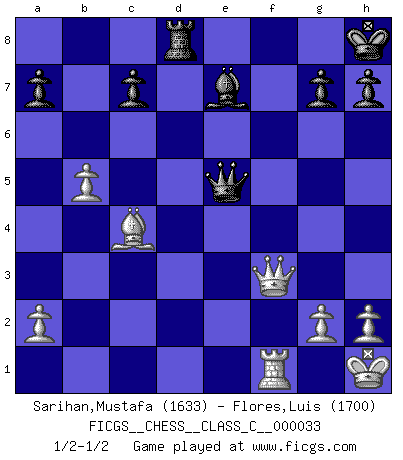Last move : 1/2-1/2 2007 June 27 11:16:29 [Event "FICGS__CHESS__CLASS_C__000033"] [Site "FICGS"] [Date "2007.03.07"] [Round "1"] [White "Sarihan,Mustafa"] [Black "Flores,Luis"] [Result "1/2-1/2"] [WhiteElo "1633"] [BlackElo "1700"] 1.c4 Nf6 2.Nc3 e5 3.e3 d5 4.d4 exd4 5.exd4 Be7 6.Nf3 O-O 7.Be2 dxc4 8.Bxc4 Bg4 9.O-O Nc6 10.Be3 Bxf3 11.Qxf3 Nxd4 12.Qxb7 Nf5 13.Qf3 Nxe3 14.fxe3 Rb8 15.Rad1 Qe8 16.b3 Bc5 17.Rd3 Rd8 18.Nd5 Nxd5 19.Bxd5 Qe5 20.Bxf7+ Kh8 21.Rxd8 Bxe3+ 22.Kh1 Rxd8 23.b4 Bg5 24.Bc4 Be7 25.b5 1/2-1/2 English Opening Kingside Castling by player Black (move 6) Kingside Castling by player White (move 9) This chess game ended in a draw. Follow this game move after move (download)Chess is the gymnasium of the mind. (Blaise Pascal) Jeder Schachmeister war einmal ein Anfänger. (Irving Chernev) Nunca nadie ha ganado una partida de Ajedrez rindiendose. (Unknown) Le système Elo représente seulement une moyenne. Il est simplement un indicateur de votre stabilité. (Anatoli Karpov) Either move or be moved. (Ezra Pound)