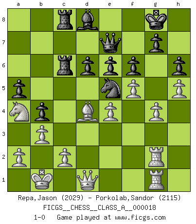 Last move : 1-0 2007 December 5 8:21:54 [Event "FICGS__CHESS__CLASS_A__000018"] [Site "FICGS"] [Date "2007.03.07"] [Round "1"] [White "Repa,Jason"] [Black "Porkolab,Sandor"] [Result "1-0"] [WhiteElo "2029"] [BlackElo "2115"] 1.e4 c5 2.Nf3 d6 3.d4 cxd4 4.Nxd4 Nf6 5.Nc3 a6 6.Be3 Nc6 7.f3 e6 8.Qd2 Be7 9.O-O-O O-O 10.g4 Nxd4 11.Bxd4 b5 12.Kb1 Nd7 13.h4 Qc7 14.h5 h6 15.Bd3 b4 16.Na4 Rb8 17.b3 Bb7 18.Rdg1 Ne5 19.Be2 Rfc8 20.Bb6 Qc6 21.Be3 f6 22.f4 Nf7 23.Ba7 Ra8 24.Bf2 Rab8 25.Re1 Qe8 26.Nb6 Rc6 27.Rhf1 Qd8 28.Na4 Qc7 29.Ba7 Rc8 30.Bd3 a5 31.Be3 Ba6 32.Bxa6 Rxa6 33.Rf2 Bd8 34.Qd3 Rc6 35.Rfe2 Qb7 36.Rc1 Qd7 37.Rg2 Rb8 38.Rcg1 Rbc8 39.Qd1 Qc7 40.Qc1 Qb7 41.f5 Qe7 42.Qd1 Ne5 43.Bd4 1-0 This chess game has been lost on time (started : 2007.03.07 12:24:5) Sicilian : Najdorf, Byrne (English) attack Queenside Castling by player White (move 9) Kingside Castling by player Black (move 9) Player White won this chess game. Follow this game move after move (download)Examine moves that smite! A good eye for smites is far more important than a knowledge of strategical principles. (Purdy) Ja, ich habe einmal eine Blitzpartie gespielt, es war in einem Zug, 1929. --im Interview 1989 (Mikhail Moiseyevich Botvinik) Una compensación adecuada por un sacrificio es tener una combinación sólida que conduce a una posición ganadora; una compensación adecuada por una metida de pata es dejar a tu oponente arrebatar una derrota de las fauces de la victoria. (Bruce A. Moon) On entre au jeu d'Echecs comme on entre en Religion. Pour le joueur d'Echecs, la partie d'Echecs c'est l'office, la messe, le défilé du 1er Mai, le dépôt de gerbe au Monument aux Morts. C'est un drame sacré. (Michel Roos) Memory is a way of holding onto the things you love, the things you are, the things you never want to lose. (from the television show: The Wonder Years)