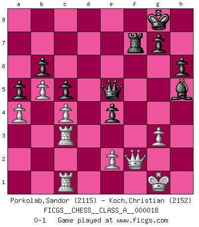 Last move : 0-1 2007 November 26 19:49:55 [Event "FICGS__CHESS__CLASS_A__000018"] [Site "FICGS"] [Date "2007.03.07"] [Round "1"] [White "Porkolab,Sandor"] [Black "Koch,Christian"] [Result "0-1"] [WhiteElo "2115"] [BlackElo "2152"] 1.Nf3 Nf6 2.g3 d5 3.Bg2 c6 4.d3 Bg4 5.O-O Nbd7 6.Nc3 e5 7.h3 Be6 8.Ng5 Bc5 9.Na4 Qe7 10.Nxc5 Nxc5 11.c3 O-O 12.b4 Ncd7 13.Be3 Bf5 14.Nf3 e4 15.Nd4 Bg6 16.Qd2 Rfe8 17.Bf4 Ne5 18.Rfe1 h6 19.a4 a5 20.b5 c5 21.Nf3 Ned7 22.Nh2 Nf8 23.Ng4 Ne6 24.Rad1 Rad8 25.Be5 Nxg4 26.hxg4 b6 27.dxe4 Bxe4 28.f3 Bg6 29.f4 f6 30.f5 fxe5 31.Bxd5 Bf7 32.fxe6 Bxe6 33.Qa2 Rxd5 34.Rxd5 Qg5 35.Qd2 Qxg4 36.Rd3 e4 37.Re3 Qg5 38.Qc1 Bh3 39.c4 Rf8 40.Rc3 Qe5 41.Qd2 Rf7 42.Rec1 Bg4 43.Qe3 Bf3 44.Qf2 Bh5 0-1 This chess game has been lost on time (started : 2007.03.07 12:24:5) Reti Opening Kingside Castling by player White (move 5) Kingside Castling by player Black (move 11) Player Black won this chess game. Follow this game move after move (download)When you don't know what to play, wait for an idea to come into your opponent's mind. You may be sure that idea will be wrong. (Siegbert Tarrasch) Spielt Blackmar-Diemer-Gambit, und das Matt kommt von selbst! (Emil Joseph Diemer) Evita las multitudes. Haz independientemente tu propio razonamiento. Trata de ser el jugador de Ajedrez, no la pieza de Ajedrez. (Ralph Charell) Pour moi, les échecs ne sont pas un jeu mais un art. (Alexandre Alekhine) Without enthusiasm, virtue functions not at all, and vice only poorly. (Mignon McLaughlin, The Neurotic's Notebook, 1960)