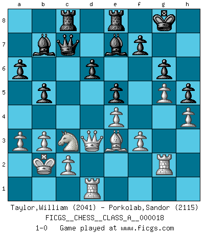 Last move : 1-0 2007 December 4 8:17:2 [Event "FICGS__CHESS__CLASS_A__000018"] [Site "FICGS"] [Date "2007.03.07"] [Round "1"] [White "Taylor,William"] [Black "Porkolab,Sandor"] [Result "1-0"] [WhiteElo "2041"] [BlackElo "2115"] 1.e4 c5 2.Nf3 d6 3.d4 cxd4 4.Nxd4 Nf6 5.Nc3 a6 6.Be3 e6 7.f3 b5 8.g4 Bb7 9.Qd2 Be7 10.O-O-O Nfd7 11.h4 Nc6 12.a3 Rc8 13.Nxc6 Rxc6 14.Kb1 Ne5 15.Be2 h5 16.g5 Nc4 17.Bxc4 Rxc4 18.Bf4 e5 19.Be3 O-O 20.b3 Rc8 21.Rh2 Qc7 22.Kb2 Rfe8 23.Rg2 g6 24.Qd3 1-0 This chess game has been lost on time (started : 2007.03.07 12:24:5) Sicilian : Najdorf, Byrne (English) attack Queenside Castling by player White (move 10) Kingside Castling by player Black (move 19) Player White won this chess game. Follow this game move after move (download)No one ever won a game by resigning. (Unknown) Es ist nicht das erste mal, dass sich die FIDE dem Arabischen Geld gebeugt hat (über die FIDE WM 2004 in Lybien). (Larry Evans) No es tiempo de jugar al Ajedrez cuando la casa esta en llamas. (Proverbio Italiano) Ce n'est pas pour s'amuser qu'il joue aux échecs : il célèbre un culte. (Vladimir Nabokov) Rules and bones are meant to be broken. (Anonymous)