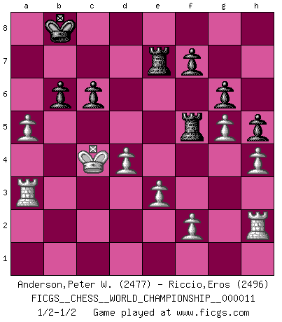 Last move : 1/2-1/2 2015 November 5 12:59:12 [Event "FICGS__CHESS__WORLD_CHAMPIONSHIP__000011"] [Site "FICGS"] [Date "2015.07.05"] [Round "4"] [White "Anderson,Peter W."] [Black "Riccio,Eros"] [Result "1/2-1/2"] [WhiteElo "2477"] [BlackElo "2496"] 1.d4 d5 2.c4 e6 3.Nc3 Nf6 4.cxd5 exd5 5.Bg5 c6 6.Qc2 Be7 7.e3 Nbd7 8.Nf3 Nh5 9.Bxe7 Qxe7 10.h3 g6 11.g4 Nhf6 12.O-O-O Nb6 13.Ne5 Be6 14.Kb1 Nfd7 15.Nd3 O-O-O 16.Be2 Kb8 17.Nf4 Nf6 18.Nxe6 Qxe6 19.Bd3 Ne8 20.a4 Nd6 21.a5 Nbc4 22.Qa4 h5 23.g5 Qe7 24.Qb4 Rhe8 25.h4 Ne4 26.Qxe7 Nxc3+ 27.Kc2 Rxe7 28.Kxc3 Nxa5 29.b4 Nc4 30.Bxc4 dxc4 31.Kxc4 Rd5 32.Ra1 Rf5 33.Rh2 b6 34.Ra3 a5 35.bxa5 1/2-1/2 QGD : Exchange, positional line, 6.Qc2 Queenside Castling by player White (move 12) Queenside Castling by player Black (move 15) This chess game ended in a draw. Follow this game move after move (download)If Chess is a science, it's a most inexact one. If Chess is an art, it is too exacting to be seen as one. If Chess is a sport, it's too esoteric. If Chess is a game, it's too demanding to be just a game. If Chess is a mistress, she's a demanding one. If Chess is a passion, it's a rewarding one. If Chess is life, it's a sad one. (Unknown) Man wirke der falschen Auffassung entgegen, als ob jeder Zug Unmittelbares zu leisten habe; auch Werte- und Ruhezüge haben ihre Existenzberechtigung. (Aaron Nimzowitsch) No puedes jugar al Ajedrez si eres de corazón noble. (Proverbio Francés) On est toujours la mazette de quelqu'un d'autre. (Anonyme) Is not life a hundred times too short to bore ourselves ? (Friedrich Nietzsche)