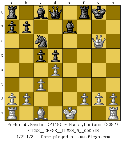 Last move : 1/2-1/2 2007 May 15 11:39:27 [Event "FICGS__CHESS__CLASS_A__000018"] [Site "FICGS"] [Date "2007.03.07"] [Round "1"] [White "Porkolab,Sandor"] [Black "Nucci,Luciano"] [Result "1/2-1/2"] [WhiteElo "2115"] [BlackElo "2057"] 1.e4 e6 2.Qe2 c5 3.Nf3 Nf6 4.e5 Nd5 5.Nc3 Nc6 6.Nxd5 exd5 7.c3 d6 8.d4 dxe5 9.Nxe5 Be7 10.Qh5 O-O 11.Bd3 g6 12.Nxg6 fxg6 13.Bxg6 hxg6 14.Qxg6+ Kh8 15.Qh6+ Kg8 16.Qg6+ 1/2-1/2 French : Chigorin variation Kingside Castling by player Black (move 10) This chess game ended in a draw. Follow this game move after move (download)Your body has to be in top condition. Your Chess deteriorates as your body does. You can't separate body from mind. (Bobby Fischer) Mit Schach schule ich mein Gefühl für Geometrie, was für Tennis und Schach gleichermaßen wichtig ist. (Boris Becker) Estaba muy claro de que el punto vulnerable del Gran Maestro Americano (Bobby Fischer) radicaba en las posiciones de doble filo, colgantes, irracionales, donde el siempre falló en encontrar un triunfo aún en una posición de clara victoria. (Efim Geller) On n'a jamais que l'âge auquel on a commence à jouer aux échecs car après on cesse de vieillir. (Capablanca) Information on the Internet is subject to the same rules and regulations as conversation at a bar. (George Lundberg)