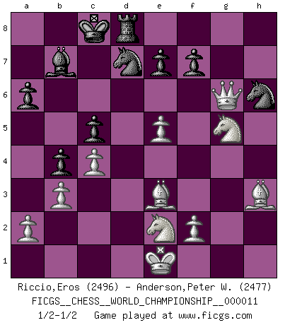 Last move : 1/2-1/2 2015 October 17 17:42:8 [Event "FICGS__CHESS__WORLD_CHAMPIONSHIP__000011"] [Site "FICGS"] [Date "2015.07.05"] [Round "5"] [White "Riccio,Eros"] [Black "Anderson,Peter W."] [Result "1/2-1/2"] [WhiteElo "2496"] [BlackElo "2477"] 1.e4 g6 2.d4 Bg7 3.Nc3 d6 4.Be3 a6 5.g4 b5 6.Bg2 Nd7 7.h4 Bb7 8.h5 gxh5 9.g5 c5 10.Rxh5 Nb6 11.b3 h6 12.Nh3 Nd7 13.Ne2 Qa5+ 14.c3 b4 15.c4 hxg5 16.Rxh8 Bxh8 17.Nxg5 Nh6 18.Bh3 O-O-O 19.dxc5 Bxa1 20.Qxa1 dxc5 21.Qg7 Qb6 22.e5 Qg6 23.Qxg6 1/2-1/2 Robatsch (Modern) defense Queenside Castling by player Black (move 18) This chess game ended in a draw. Follow this game move after move (download)Chess holds its master in its own bonds, shackling the mind and brain so that the inner freedom of the very strongest must suffer. (Albert Einstein) Es hat in meinem Leben Zeiten gegeben, in denen das Schachspiel, wenn nicht zum Lebenszweck, so doch zu einem regelrechten Lebensersatz geworden ist. Man fühlt sich in solchen Zeiten nicht so, als besäße man eine göttliche Gabe, sondern eher so, als sei man von ihr besessen. (Garry Kasparov) Si tu oponente no puede hacer nada activo, entonces no apures la posición; En vez de eso, dejalo estar sentado ahí, sufriendo y rogandote por un empate. (Jeremy Silman) Tout change constamment, y compris dans le monde des Echecs. (Botvinnik) If everyone is thinking alike, then somebody isn't thinking. (US General George S. Patton)