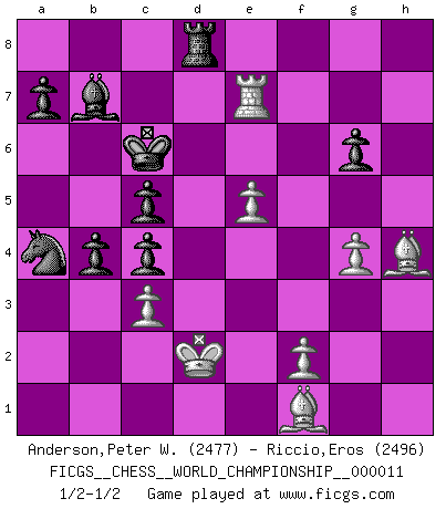 Last move : 1/2-1/2 2015 October 19 15:30:46 [Event "FICGS__CHESS__WORLD_CHAMPIONSHIP__000011"] [Site "FICGS"] [Date "2015.07.05"] [Round "8"] [White "Anderson,Peter W."] [Black "Riccio,Eros"] [Result "1/2-1/2"] [WhiteElo "2477"] [BlackElo "2496"] 1.d4 d5 2.c4 e6 3.Nf3 Nf6 4.Nc3 c6 5.Bg5 h6 6.Bh4 dxc4 7.e4 g5 8.Bg3 b5 9.h4 g4 10.Ne5 Bb7 11.Nxg4 Nxg4 12.Qxg4 Qxd4 13.Rd1 Qf6 14.a4 h5 15.Qg5 Qxg5 16.hxg5 Bb4 17.Be5 Rh7 18.Bf6 Nd7 19.e5 h4 20.Ke2 Bxc3 21.bxc3 Nb6 22.Rd6 Nxa4 23.Kd2 c5 24.g6 fxg6 25.Rxe6+ Kd7 26.Rxh4 Rxh4 27.Re7+ Kc6 28.Bxh4 b4 29.g4 Rd8+ 1/2-1/2 Queen's gambit declined This chess game ended in a draw. Follow this game move after move (download)We must make sure that Chess will not be like a dead language, very interesting, but for a very small group. (Sytze Faber) Schach ist mein Leben, meine Leidenschaft, was ich gelernt habe und seit meinem 14. Lebensjahr profimässig praktiziere. Darauf zu verzichten, würde mir sehr schwer fallen. (Viktor Kortschnoi) El Ajedrez es una hermosa aventura. (Bent Larsen) D'abord les bases : Jouez et étudiez, puis étudiez et jouez, ensuite jouez et étudiez, puis étudiez et jouez. Deuxièmement : Donnez toujours le meilleur de vous-même ! (Ken Smith) Internal peace cannot coexist with external war. (Don Groves)