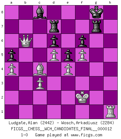 Last move : 1-0 2015 November 2 18:10:27 [Event "FICGS__CHESS__WCH_CANDIDATES_FINAL__000012"] [Site "FICGS"] [Date "2015.07.05"] [Round "1"] [White "Ludgate,Alan"] [Black "Wosch,Arkadiusz"] [Result "1-0"] [WhiteElo "2442"] [BlackElo "2284"] 1.c4 Nf6 2.Nc3 e5 3.g3 Bb4 4.Bg2 O-O 5.e4 Bxc3 6.bxc3 d6 7.Ne2 Nbd7 8.O-O a6 9.a4 a5 10.d3 h6 11.f4 b6 12.h3 Nh7 13.g4 Re8 14.Ng3 Ndf8 15.Qf3 f6 16.f5 Bb7 17.h4 Re7 18.Qd1 Nd7 19.d4 Ba6 20.Qb3 Kh8 21.Rd1 Bb7 22.Be3 Qg8 23.Bf3 Qf7 24.Rd2 Ba6 25.d5 Rg8 26.Rh2 Nc5 27.Qa2 R7e8 28.g5 Qe7 29.g6 Nf8 30.Be2 Ra8 31.Qc2 Ra7 32.Rg2 c6 33.Nh5 Rc7 34.Bxh6 Bb7 35.Be3 cxd5 36.cxd5 Nfd7 37.Nxg7 Kxg7 38.h5 Rd8 39.h6+ Kg8 40.g7 Nf8 41.gxf8Q+ Kxf8 42.Rg7 Qxg7+ 43.hxg7+ Rxg7+ 44.Kf2 Kg8 45.Bxc5 bxc5 46.Qb2 c4 47.Qb6 R8d7 48.Bxc4 Bc8 49.Rh1 1-0 English Opening Kingside Castling by player Black (move 4) Kingside Castling by player White (move 8) Promotion Queen by player White (move 41) Player White won this chess game. Follow this game move after move (download)Discovered check is the dive bomber of the Chessboard. (Reuben Fine) Ich habe die besten Aussichten, den ersten Preis zu gewinnen - denn jeder muss gegen Steinitz spielen, nur ich nicht! (Wilhelm Steinitz) Todavía soy una víctima del Ajedrez. Tiene toda la belleza del arte y mucho mas. No puede ser comercializado. El Ajedrez es mas puro que el arte en su posición social. (Marcel Duchamp) Lorsque vous vous retrouvez devant une position atroce, ne tendez pas un ultime piège dérisoire avec l'intention d'abandonner si l'adversaire le déjoue ! Faites-vous plutôt un devoir de résister comme si votre vie en dépendait. Jouez le coup qui vous déplairait au centuple si vous étiez dans la peau de votre tortionnaire ! No, no, you're not thinking; you're just being logical. (Niels Bohr)