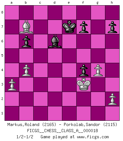 Last move : 1/2-1/2 2007 October 8 20:5:52 [Event "FICGS__CHESS__CLASS_A__000018"] [Site "FICGS"] [Date "2007.03.07"] [Round "1"] [White "Markus,Roland"] [Black "Porkolab,Sandor"] [Result "1/2-1/2"] [WhiteElo "2165"] [BlackElo "2115"] 1.e4 c5 2.c3 Nf6 3.e5 Nd5 4.Nf3 Nc6 5.Bc4 Nb6 6.Be2 d6 7.exd6 e5 8.d4 cxd4 9.cxd4 Bxd6 10.dxe5 Nxe5 11.Nxe5 Bxe5 12.Qxd8+ Kxd8 13.Nc3 Bd7 14.Be3 Rc8 15.O-O Re8 16.Rfd1 Re7 17.Bxb6+ axb6 18.Nd5 Re6 19.Rd2 Ke8 20.Rad1 g6 21.f4 Bb8 22.g3 Bd6 23.Kf1 Bc5 24.Nf6+ Rxf6 25.Rxd7 g5 26.Bf3 Kf8 27.Bxb7 Re8 28.a3 gxf4 29.g4 Re7 30.b4 Rxd7 31.Rxd7 Rd6 32.Rxd6 Bxd6 33.Ke2 Ke7 34.Kf3 1/2-1/2 Sicilian : Alapin's variation (2.c3) Kingside Castling by player White (move 15) This chess game ended in a draw. Follow this game move after move (download)Winning isn't everything... but losing is nothing. (Mednis) Schach ist ein Kampf gegen den Fehler. (Johannes Herrman Zukertort) Es muy difícil jugar en contra de la teoría de Einstein. - en su primera derrota en contra de Fischer (Mikhail Tal) Je ne crois pas en la psychologie, je crois aux bons coups. (Robert Fischer) Any activity becomes creative when the doer cares about doing it right or doing it better. (John Updike)