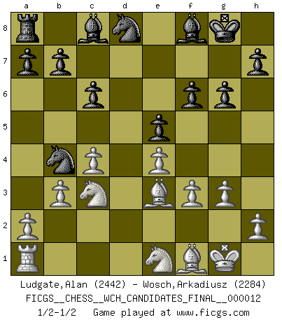Last move : 1/2-1/2 2015 September 4 18:24:48 [Event "FICGS__CHESS__WCH_CANDIDATES_FINAL__000012"] [Site "FICGS"] [Date "2015.07.05"] [Round "7"] [White "Ludgate,Alan"] [Black "Wosch,Arkadiusz"] [Result "1/2-1/2"] [WhiteElo "2442"] [BlackElo "2284"] 1.Nf3 Nf6 2.c4 g6 3.g3 Bg7 4.Bg2 O-O 5.O-O d6 6.d4 Nbd7 7.Nc3 e5 8.dxe5 dxe5 9.e4 c6 10.Qc2 Nc5 11.Be3 Qd3 12.Ne1 Qxc2 13.Nxc2 Nd3 14.b3 Ng4 15.Bg5 f6 16.Bd2 Rd8 17.f3 Nh6 18.Be3 Nf7 19.Rfd1 Bf8 20.Bf1 Nb4 21.Rxd8 Nxd8 22.Ne1 1/2-1/2 Reti Opening Kingside Castling by player Black (move 4) Kingside Castling by player White (move 5) This chess game ended in a draw. Follow this game move after move (download)Of all my Russian books, the defense contains and diffuses the greatest 'warmth' which may seem odd seeing how supremely abstract Chess is supposed to be. (Vladimir Nabokov) Die Fehler sind da, Sie warten nur darauf gemacht zu werden. (Savielly Grigorievitsch Tartakower) El Ajedrez es parte de la cultura, y si una cultura esta en decadencia, entonces también el Ajedrez declinará. (Mikhail Botvinnik) Les Echecs mettent en conflit, non pas deux intelligences, mais deux volontés. (Lasker) As a goal marker shodan is important. As a destination it is a poor place to stop. (Thomas Tamayo)