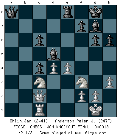 Last move : 1/2-1/2 2015 August 19 12:35:1 [Event "FICGS__CHESS__WCH_KNOCKOUT_FINAL__000013"] [Site "FICGS"] [Date "2015.07.05"] [Round "2"] [White "Ohlin,Jan"] [Black "Anderson,Peter W."] [Result "1/2-1/2"] [WhiteElo "2441"] [BlackElo "2477"] 1.d4 d5 2.c4 c6 3.Nf3 Nf6 4.Nc3 e6 5.Bg5 h6 6.Bxf6 Qxf6 7.e3 Nd7 8.Rc1 g6 9.Be2 Bg7 10.cxd5 exd5 11.b4 a6 12.a4 O-O 13.b5 axb5 14.axb5 Nb6 15.Qb3 Qd8 16.O-O Bf5 17.Rfd1 Re8 18.Rd2 Be6 19.bxc6 bxc6 20.h3 Nc4 21.Ra2 Rxa2 22.Qxa2 Qa8 23.Bxc4 dxc4 24.Qc2 Bd5 25.e4 1/2-1/2 QGD Slav : 4.Nc3 Kingside Castling by player Black (move 12) Kingside Castling by player White (move 16) This chess game ended in a draw. Follow this game move after move (download)The passed pawn is a criminal, who should be kept under lock and key. Mild measures, such as police surveillance, are not sufficient. (Nimzovitch) Ich verachte Kasparow. (Viktor Kortschnoi) Fischer deseaba darle a los Rusos una sopa de su propia medicina. (Larry Evans) Fischer est le meilleur joueur du monde et Karpov n'est qu'un joueur de bistrot. (Garry Kasparov, agé de 16 ans) The Internet is so big, so powerful and pointless that for some people it is a complete substitute for life. (Andrew Brown)