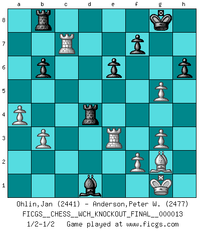 Last move : 1/2-1/2 2015 August 26 11:24:0 [Event "FICGS__CHESS__WCH_KNOCKOUT_FINAL__000013"] [Site "FICGS"] [Date "2015.07.05"] [Round "6"] [White "Ohlin,Jan"] [Black "Anderson,Peter W."] [Result "1/2-1/2"] [WhiteElo "2441"] [BlackElo "2477"] 1.Nf3 d5 2.c4 e6 3.g3 Nf6 4.Bg2 Be7 5.O-O O-O 6.d4 dxc4 7.Qc2 b5 8.a4 b4 9.Nfd2 c6 10.Nxc4 Qxd4 11.Rd1 Qc5 12.Nbd2 Ba6 13.b3 Nbd7 14.Bb2 Nb6 15.Bxf6 Bxf6 16.Ne4 Qe7 17.Nxf6+ Qxf6 18.Nxb6 axb6 19.Qxc6 Bxe2 20.Re1 Rab8 21.Qe4 Bh5 22.Qxb4 Rfd8 23.h4 Rd4 24.Qc3 Bd1 25.Qe3 Bg4 26.Rac1 h6 27.Qc3 Bd1 28.Qc7 Qd8 29.Re3 Qxc7 30.Rxc7 g5 31.hxg5 1/2-1/2 Reti Opening Kingside Castling by player White (move 5) Kingside Castling by player Black (move 5) This chess game ended in a draw. Follow this game move after move (download)There is only one thing Fischer does in Chess without pleasure: to lose ! (Boris Spassky) Zum Sieg gelangt man nicht, wenn man gut, sondern nur wenn man besser spielt (Savielly Grigorievitsch Tartakower) Un jugador que trata de regresar una movida en el Ajedrez es un futuro carterista. (Richard Fenton) Le thème de l'attaque double intervient d'une manière ou d'une autre dans l'immense majorité des combinaisons. (Youri Averbakh) Macintosh - we might not get everything right, but at least we knew the century was going to end. (Douglas Adams)